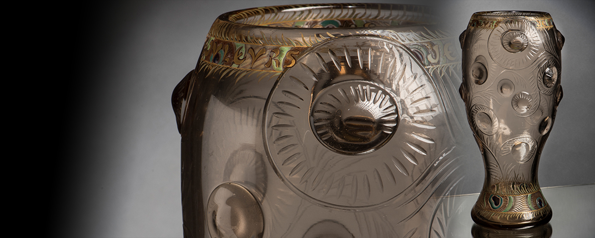Browse auction catalogue onlineA small collection of the early vases by Emile Gallé, created before 1890, perfectly represents the beginnings of the Lorraine Art Nouveau. The vase 'Plumes de Pâon', dated 1884 and estimated at € 15,000 - 18,000, is of particular importance. This impressive piece combines many production methods. Lentils are melted on the amber body both inside and outside, by using a so-called 'à chaud'(when hot) procedure. On the other hand, two different 'cold' techniques are applied for the decor. While a cold engraving technique is used for the stylised peacock feather ornament on the outer wall, the spring decor on the lower and upper edges of the mouth is done in multi-coloured enamel. The gold lettering "Je suis fier de mes couleurs" (I'm proud of my colours) elevates this vase in the genre of 'Verreries parlantes' (talking vases).