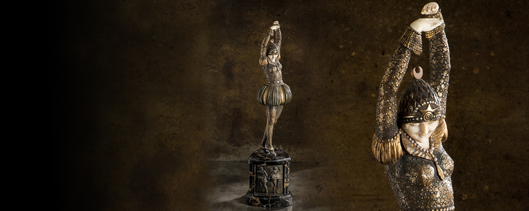 A selection of small sculptures, furniture and handicrafts will be shown on the following day, in the second part of the Art Nouveau auction. It will start with bronze and ivory figures, which have a very special appeal, due to their fine texture and execution. Noteworthy here are also the 'Bayadère' dancer in an elaborate costume with a balloon skirt by Demètre H. Chiparus (€ 30,000 - 40,000) and Ferdinand Preiss' heroic and at the same time gentle 'Diana' (€ 25,000 - 30,000). The, Serpentina 'by Otto Poertzel is called with € 20.000 and attracts everyone's attention with an almost seductive dance pose. These are followed by a series of other ivory figures that impressively reflect the zeitgeist of the Art Deco era. The next highlight is the rare, enameled table clock by Cartier with diamond-decorated rosettes in the silver body (€ 30,000 - 40,000). Sweeping lines, inlaid woodwork and floral motifs are characteristic for Art Nouveau furniture. Therefore, the unique 'Iris' cabinet by Louis Majorelle (€ 6,500 - 8,000) and the € 6,000 - 8,000 prized tiered stand by Emilé Galle perfectly captures the spirit of that time. Another masterpiece is the leaf-gilded display case by Curt Stoeving with a carved triton and niche motif (€ 5,000 - 7,500), presented for the first time in 1903 at the large art exhibition in Dresden.