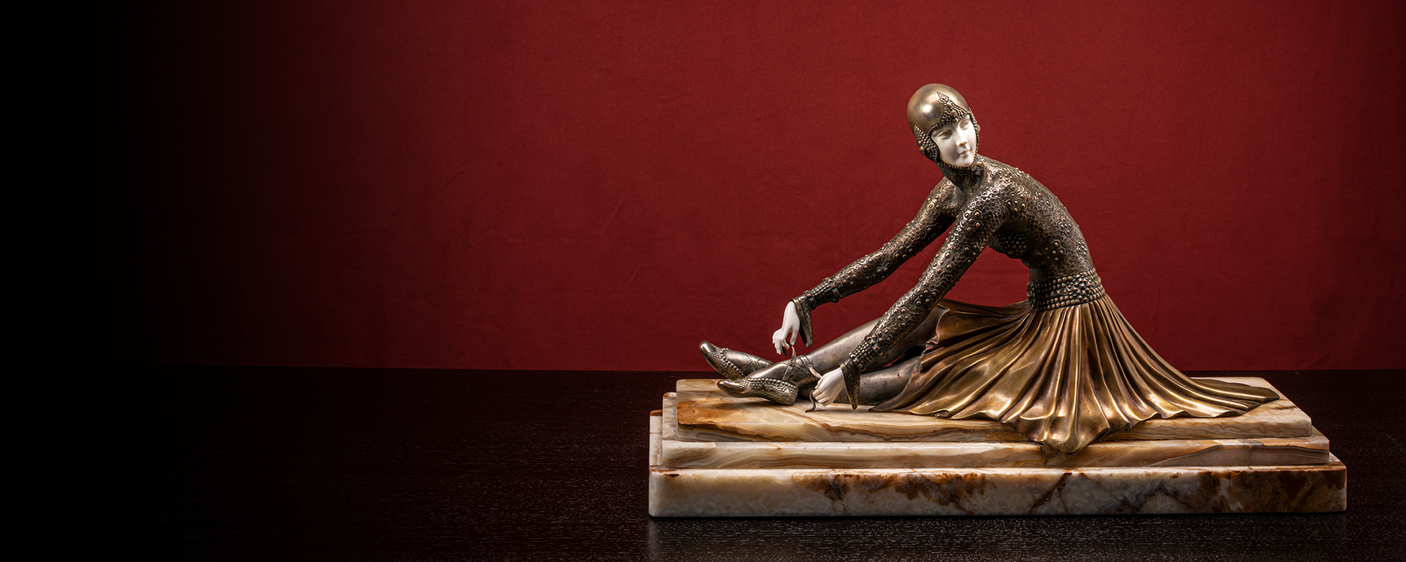 The inclined collector becomes a spectator of a lively stage scene: With elegantly spread arms and slightly bent upper body, the dancers move one step forward in sync, the tip of the right foot is on the floor, the left leg performs the dance movement. The heads are turned back, the gaze of the young women is directed towards an imaginary audience. The leotards cling to their slim bodies like a second skin, leaving only the faces of the 'girls' exposed. A comb-like headdress that starts at the top and almost reaches the shoulders gives them an Egyptian look. The faces and hands of the chryselephantine figures are finely carved from ivory. The rest of the figures is made of cold painted bronze in a beautiful copper red. If you take a closer look at the leotards, you will notice the elaborately decorated surfaces and decorations made of chains, net structures and ribbon pads, which are designed differently for each of the five women (estimate EUR 330,000 - 440,000)