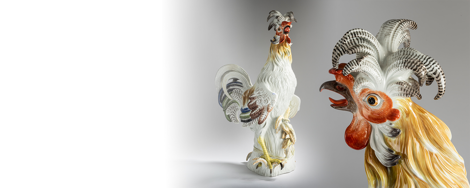 Two examples of the famous 'Paduan Rooster' stand out among the bird figurines. Designed by Ernst August Leuteritz after JJ Kaendler in 1854, the darker version was made before 1924 at the Meissen manufactory, the light rooster probably in 1936. Both figurines, with a height of 76 and 78 cm respectively, are estimated at EUR 12,000 - 16,000.