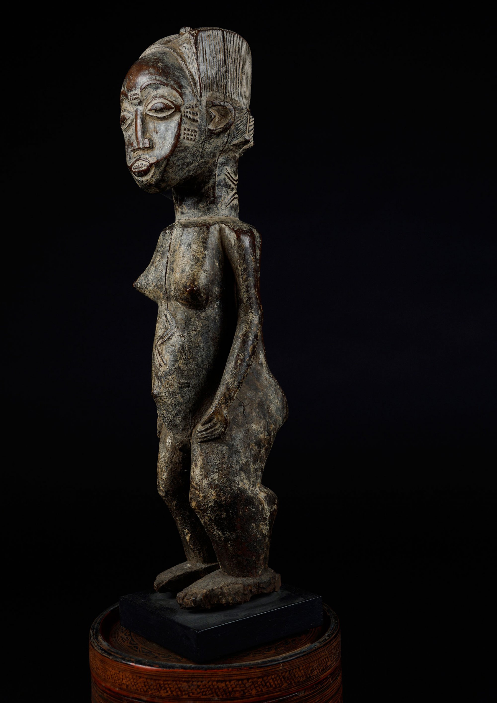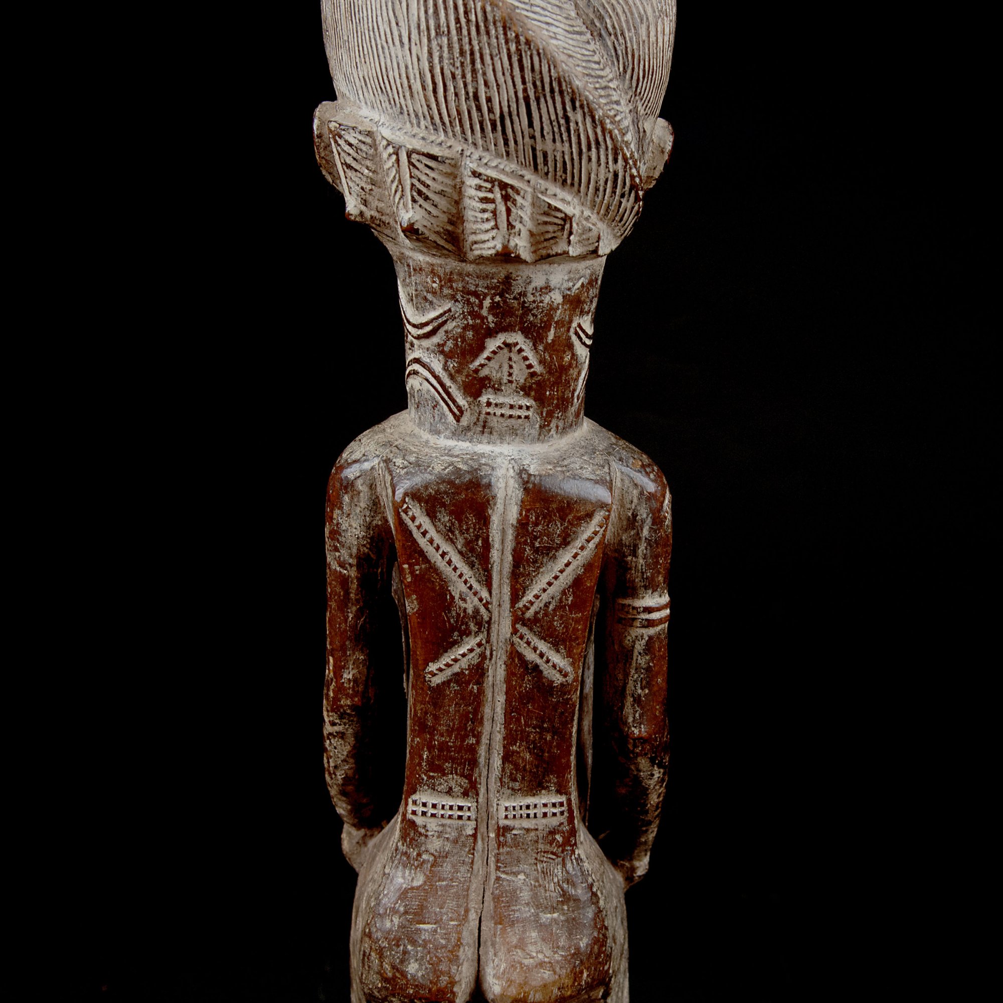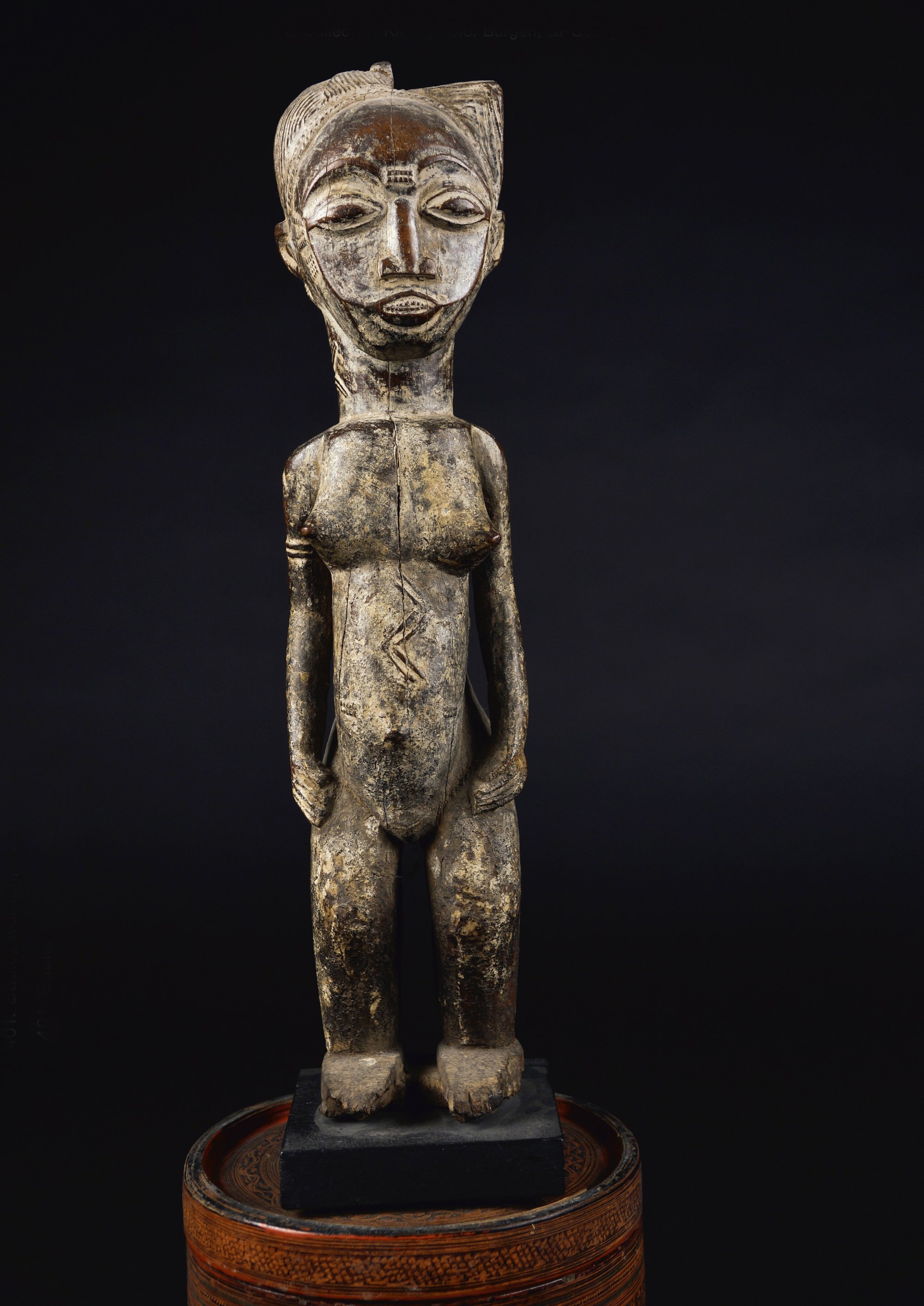 Female figure with hair parted in two. Large scarification marks on brow, temples, neck, abdomen, back, and arms. Right upper arm has a carved bangle.