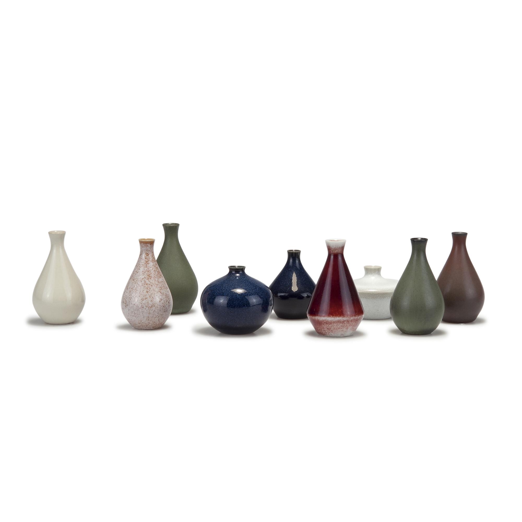 Bertil Lundgren. Nine miniature vases, 1970s. H. 4.1-7.2 cm. Made by Rörstrands Porslinsfabriker AB, Lidköping. Stoneware, polychromatic glaze. Marked: Maker's mark, designer's initials, model nos. (part).