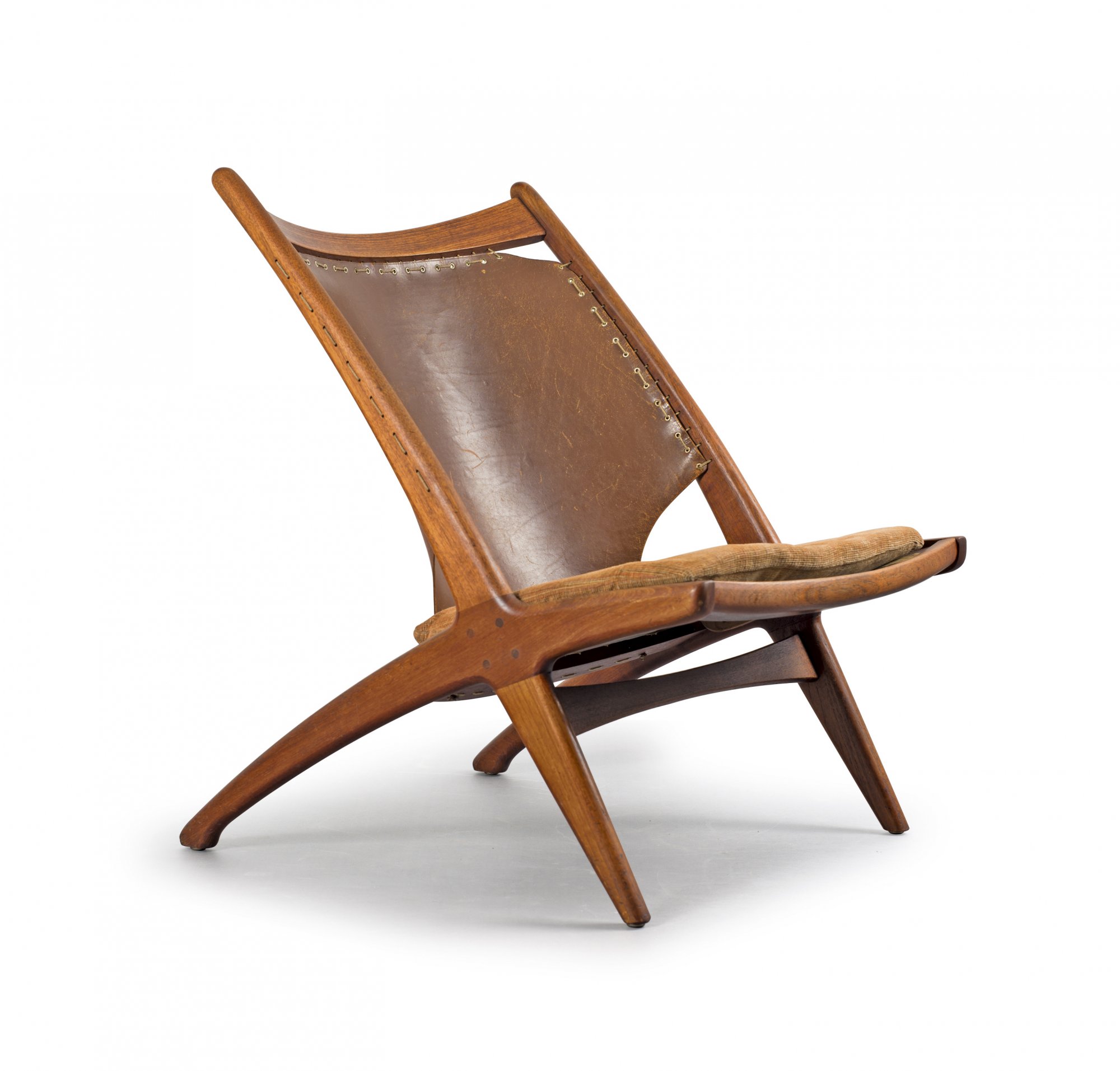 Frederik Kayser. 'Cross' chair, 1955. H. 79 x 60.5 x 73.5 cm. Made by Gustav Bahus Eft., Bergen, Norway. Teak, brown leather, cord, auburn fabric.