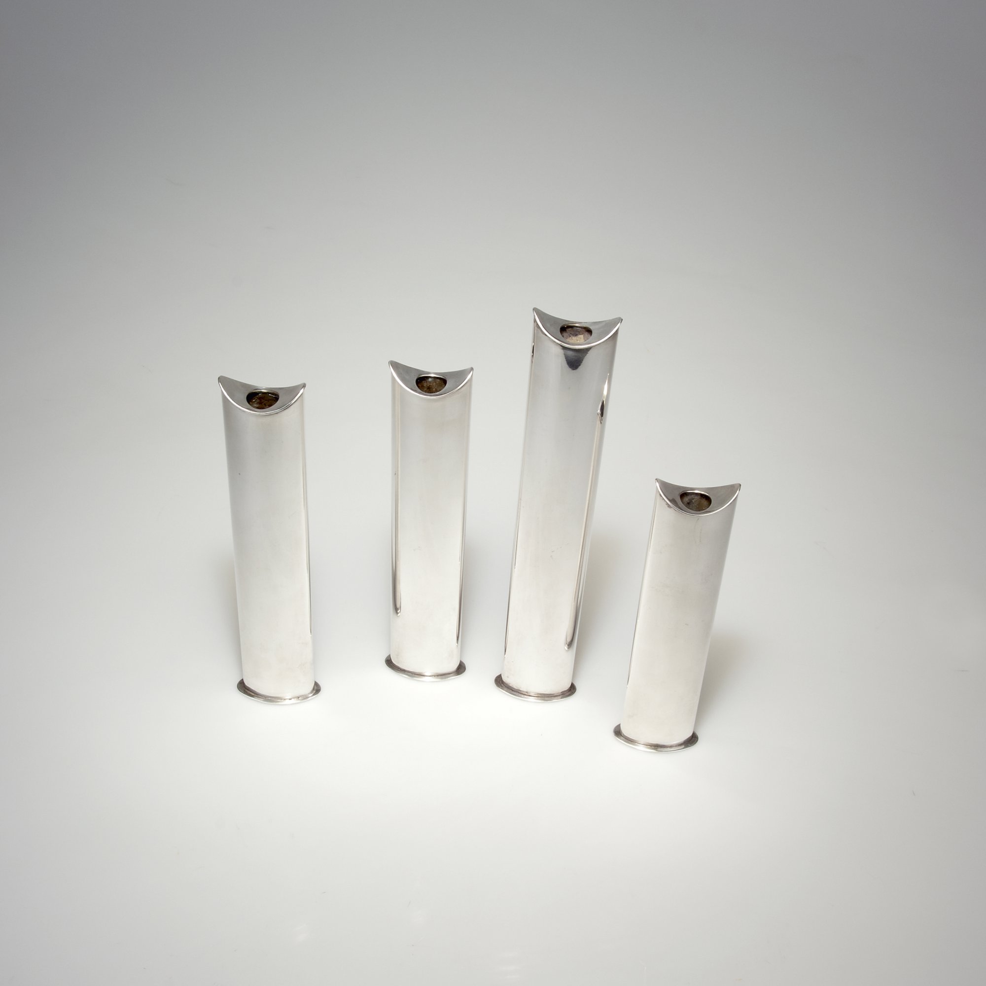 Lino Sabattini. Four candlesticks, c1965. H. 21.1-30.1 cm. Made by Sabattini, Milan. Silver-plated brass. Marked: SABATTINI ITALY.