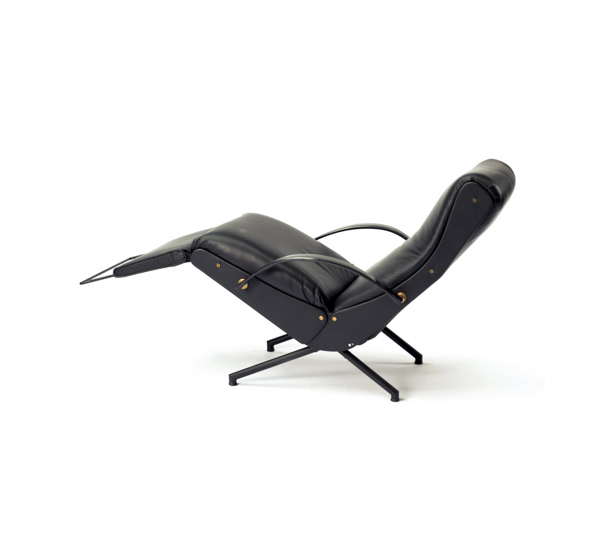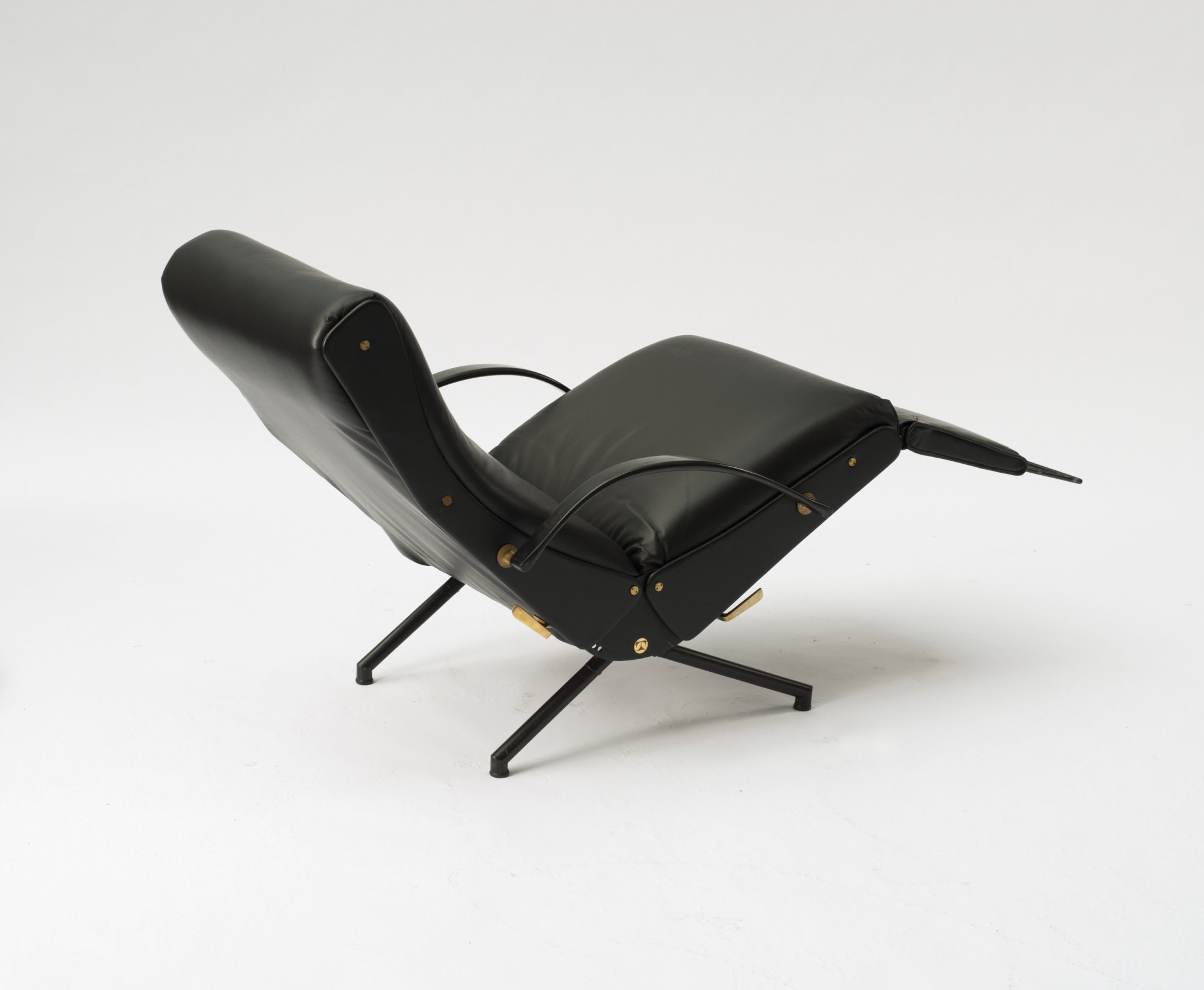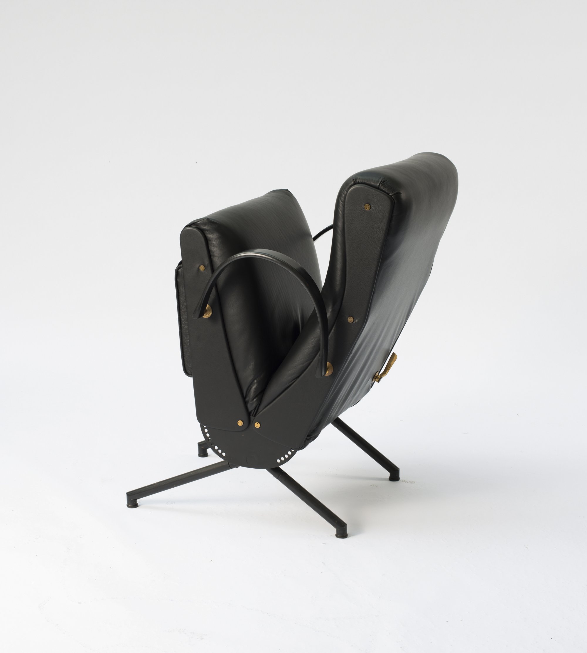 Osvaldo Borsani. 'P 40' armchair, 1955. H. 69.5 x 70.5 x 133 cm. Made by Tecno, Milan. Tubular steel, painted black, brass, black leather. Marked: Tecno badge.