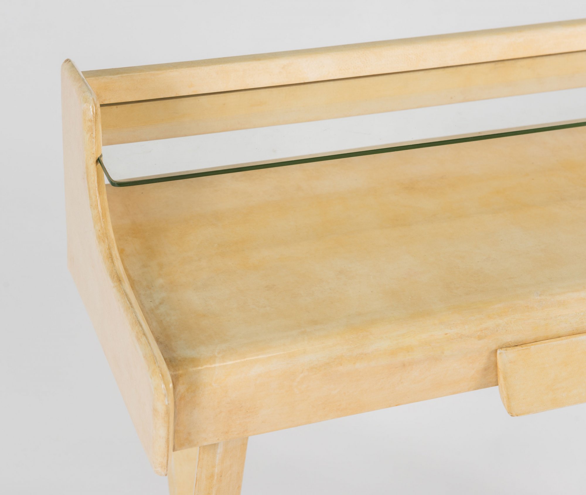 Aldo Tura (attributed). Console table, 1950s. H. 88.5 x 93.5 x 32.5 cm. Made by Tura, Milan (attributed). Wood, vanilla yellow kid leather, clear lacquer, glas.