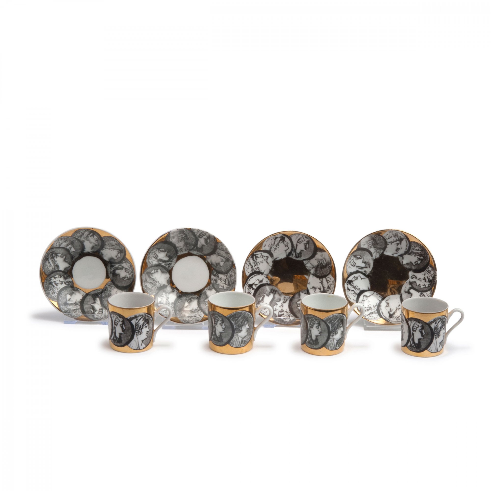 Piero Fornasetti. Four 'Cammei' mocha cups and saucers, 1950s. H. 5.1-5.4 cm. Made by Fornasetti, Milan, in the 1950/60s. Porcelain, white, glazed, overglaze, black, gold. Marked: Maker's marks.