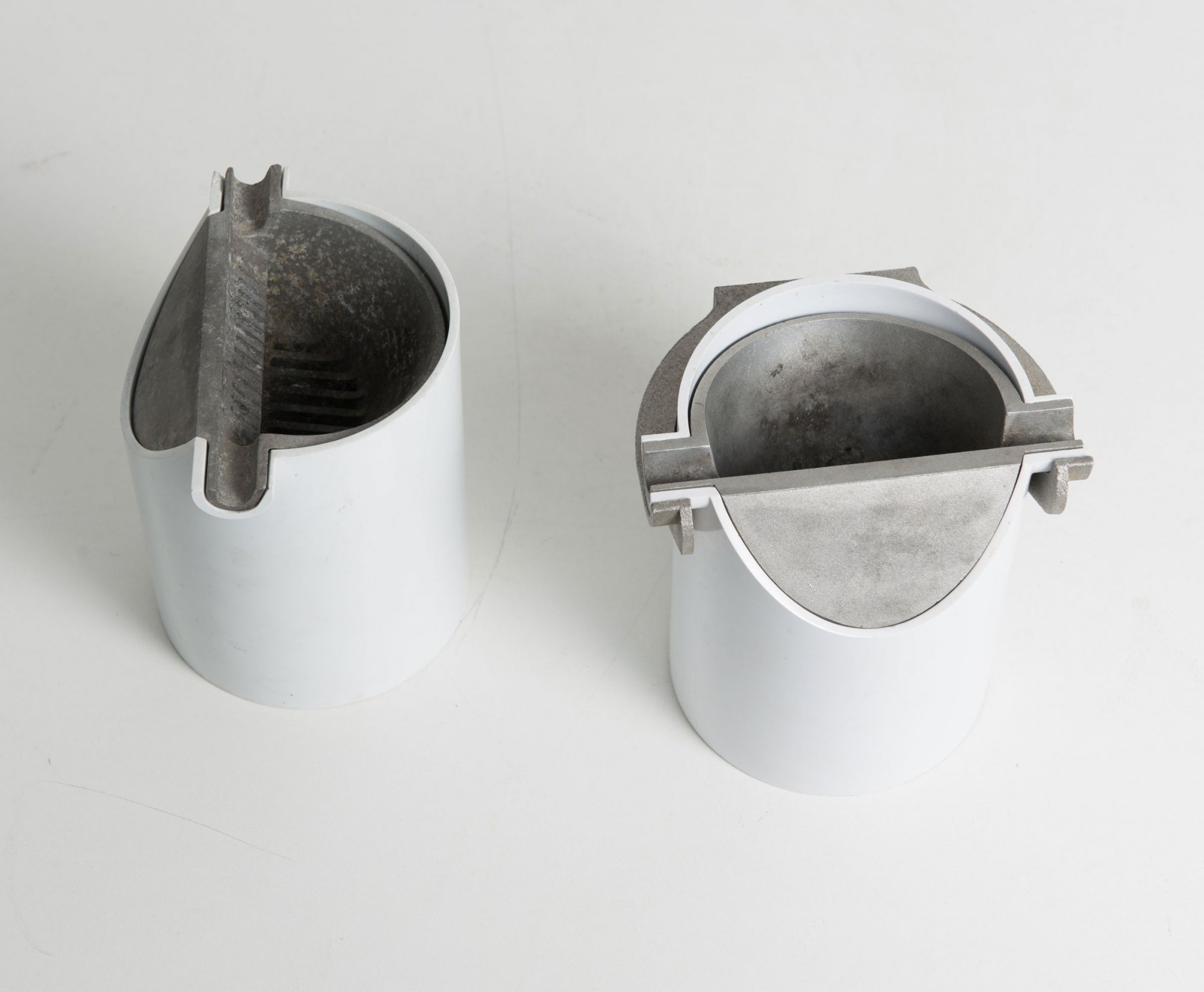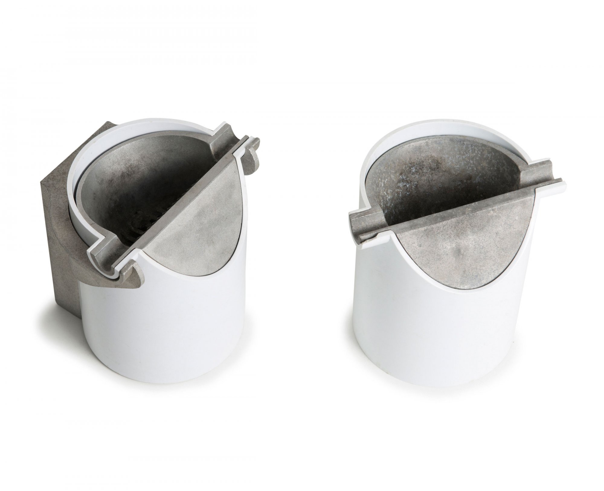 Enzo Mari. Two 'Griglia' ashtrays, 1970. H. 14.7 cm, D. 13.5 cm. Made by Danese, Milan, in 1973. Cast aluminium, white plastic. Marked: c ENZO MARI 1973 PRODUZIONE DANESE MILANO.