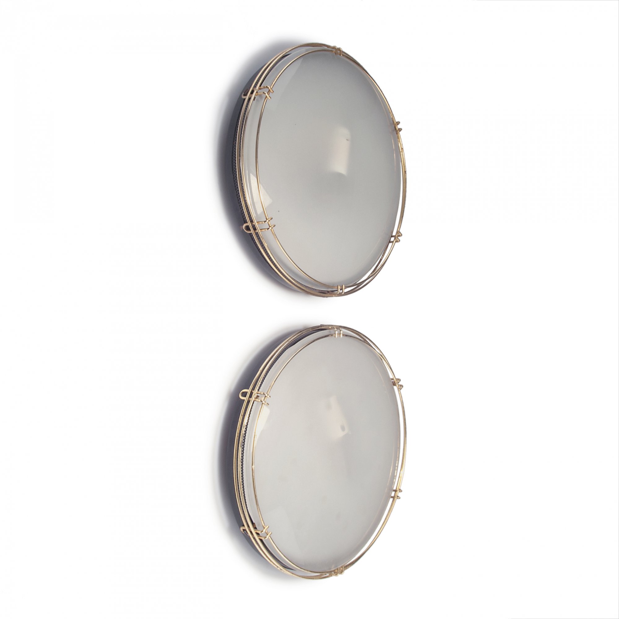 Italy. Pair of sconces, 1950s. D. 28 cm. Perforated sheet metal, painted black, brass rods, matted glass.