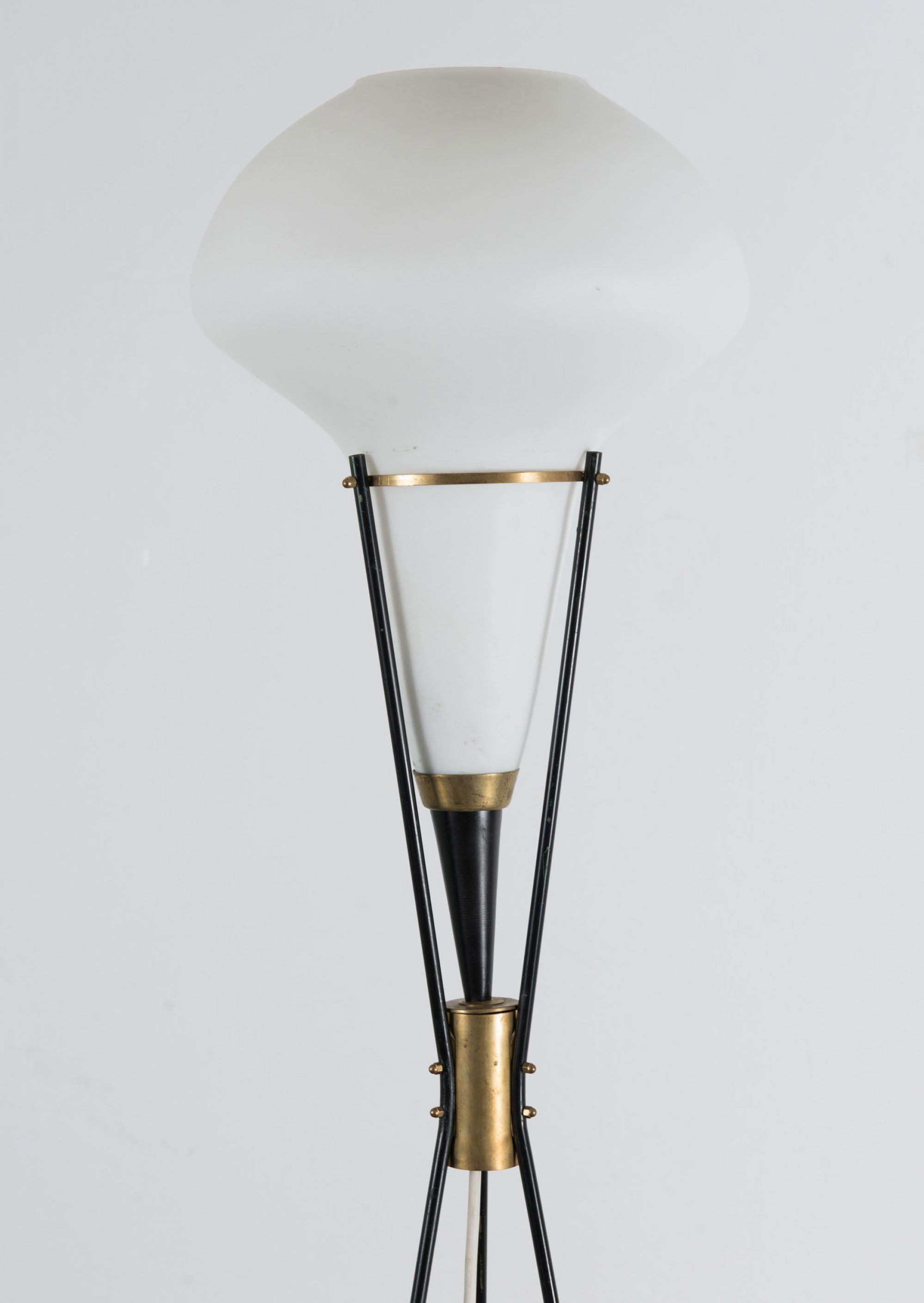 Stilnovo, Milan. Floor light, c1958. H. 162 cm. Metal rods, painted black, sheet metal, white glass.