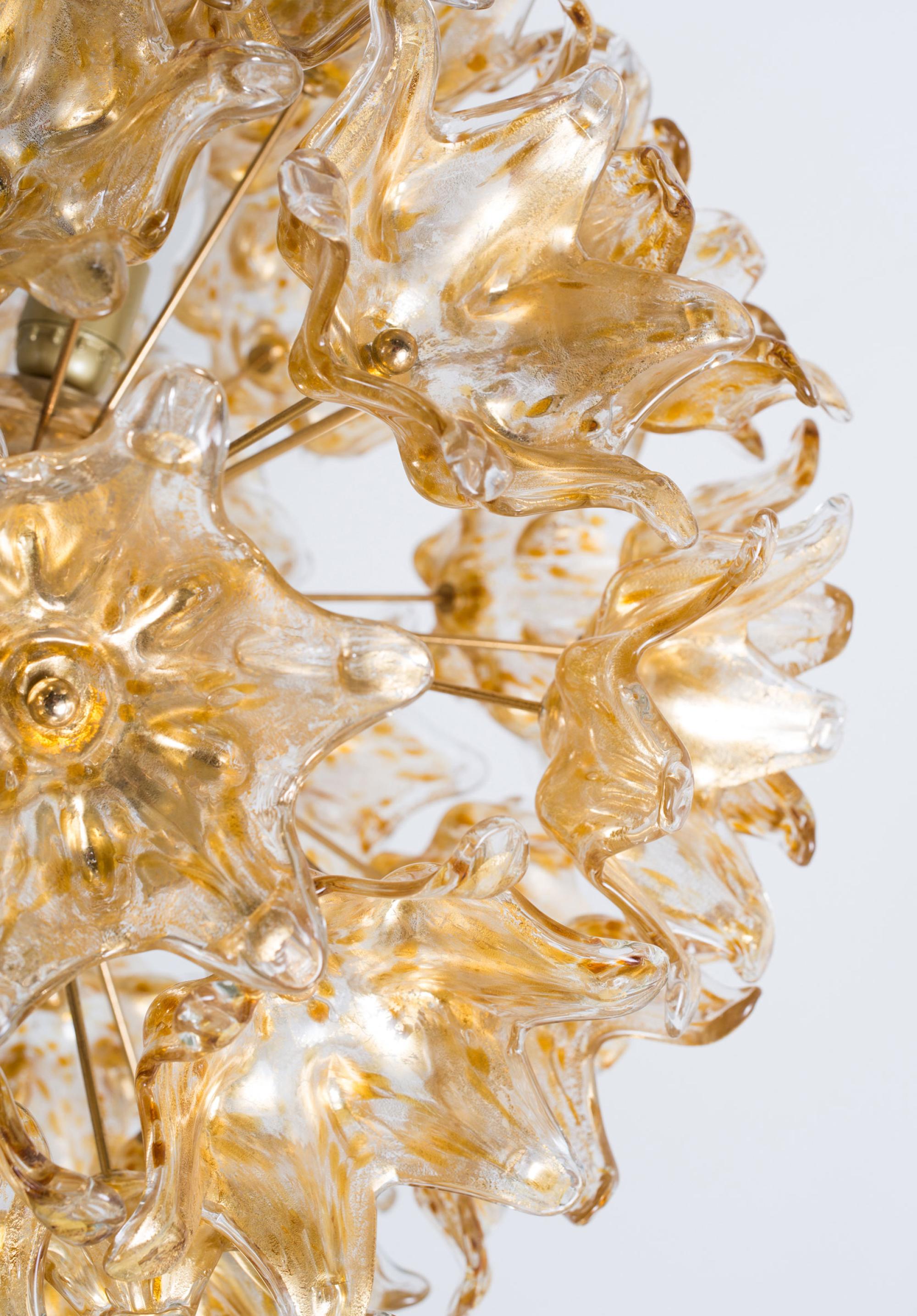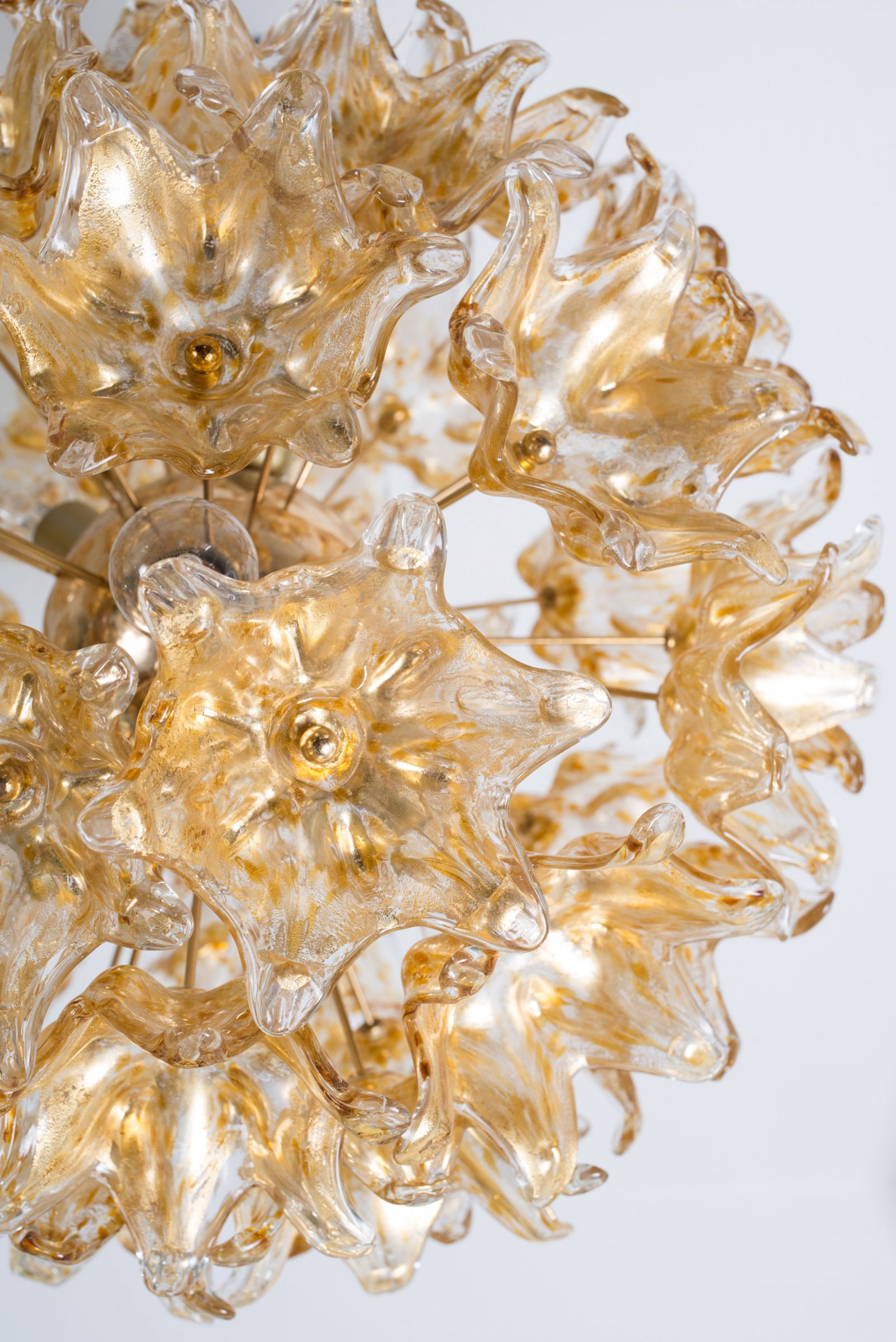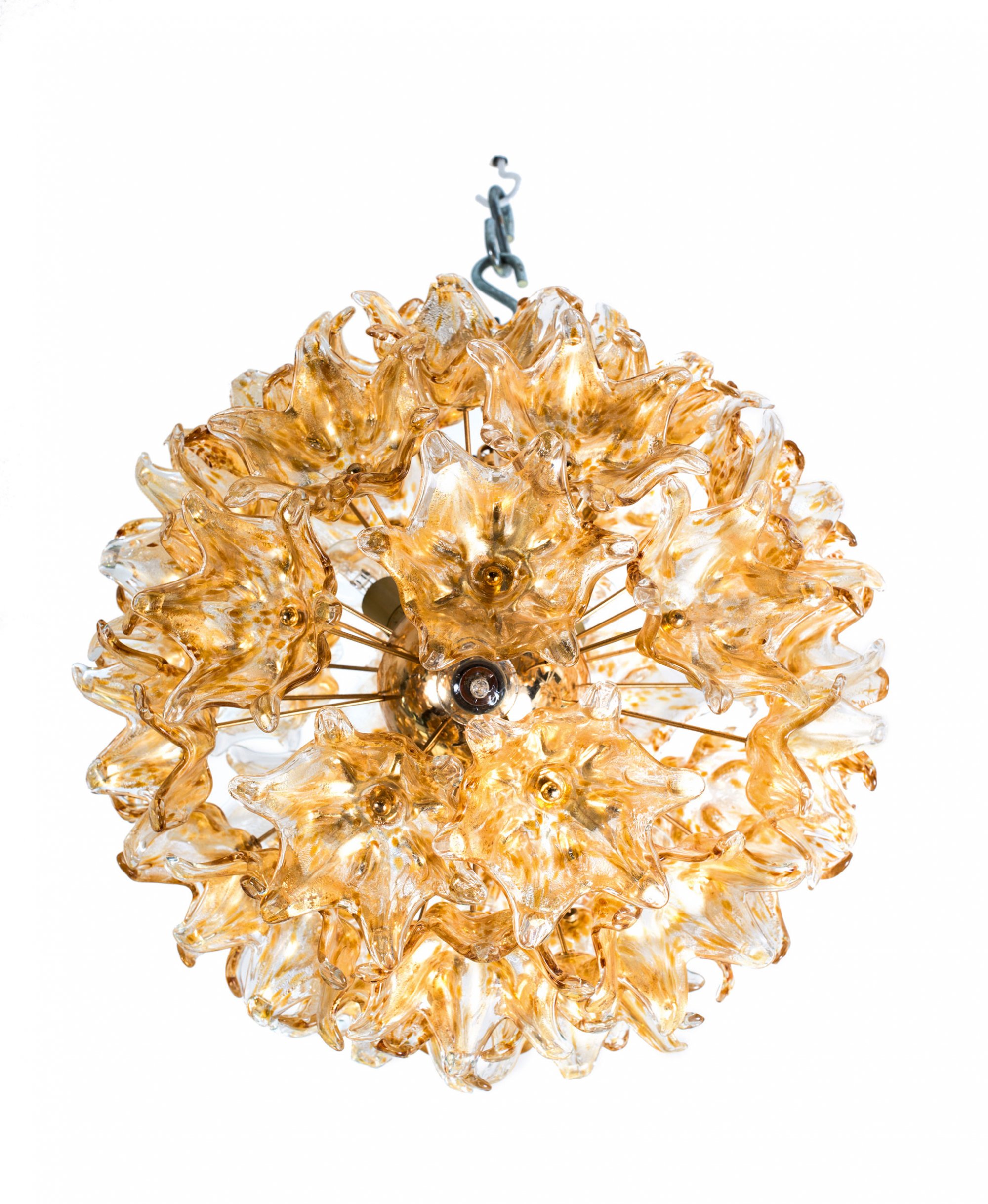 VeArt, Murano (attributed). Ceiling light, 1960s. D. 60 cm. Cased glass, clear, burst gold foil and amber spots, tubular brass, sheet brass.