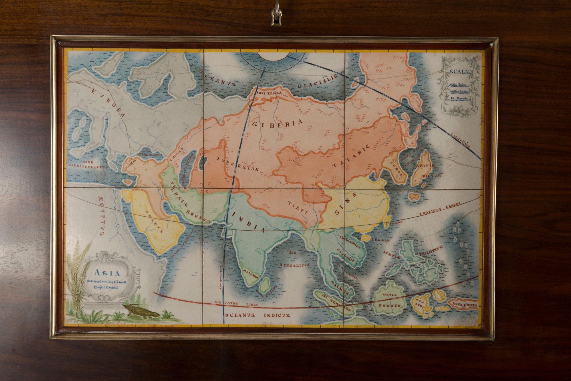 Vittorio Lombardi, Milan. Secretary, 1940s. H. 122 x 85 x 46 cm. Wooden frame, nutwood veneer, map of tiles (attr. to Richard Ginori), maple inside. Brass feet. Marked: Maker's badge.