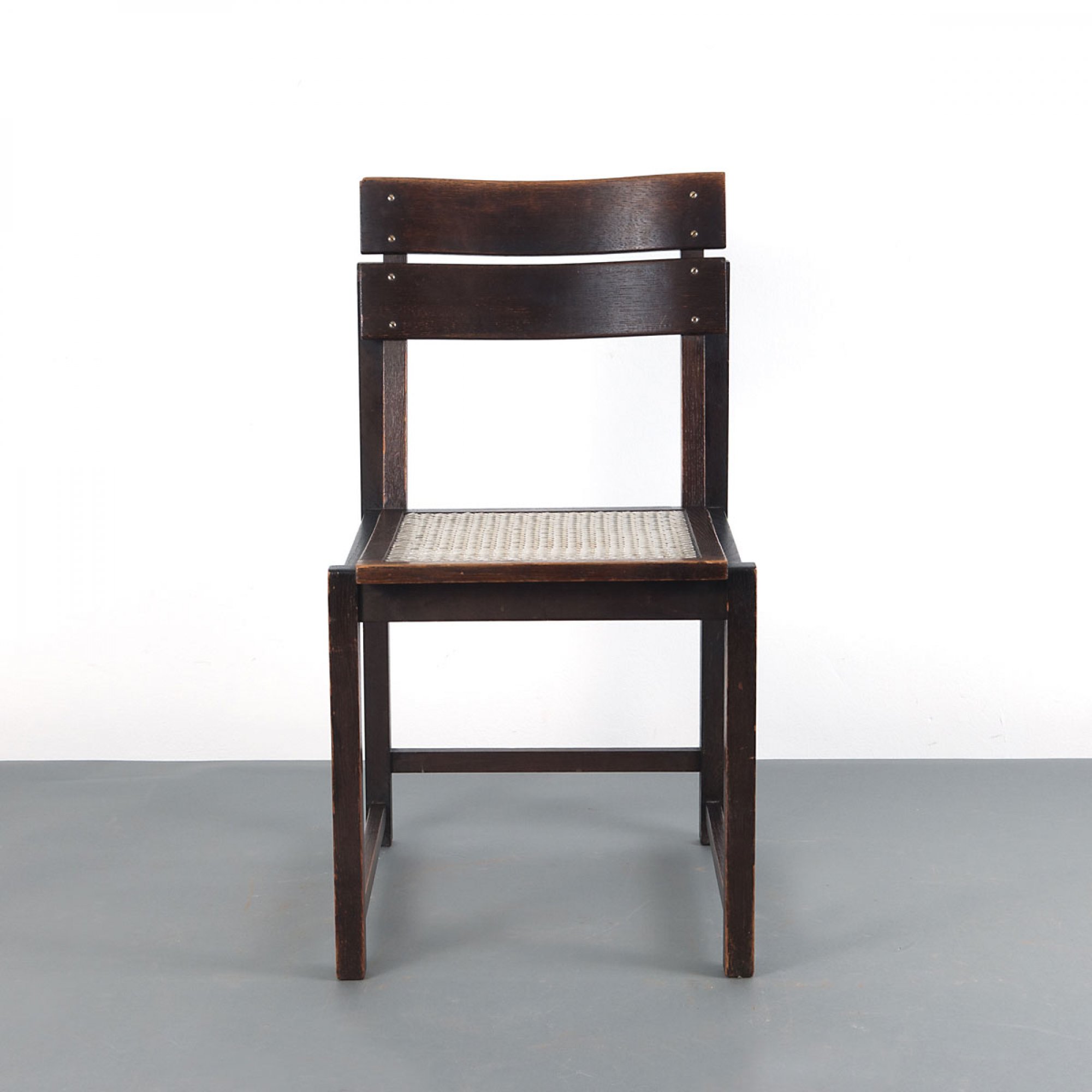 Erich Dieckmann. Chair, c1926. H. 81 x 43.5 x 52.5 cm. Made at Bauhochschule Weimar (attributed). Elmwood, stained dark, nylon work.