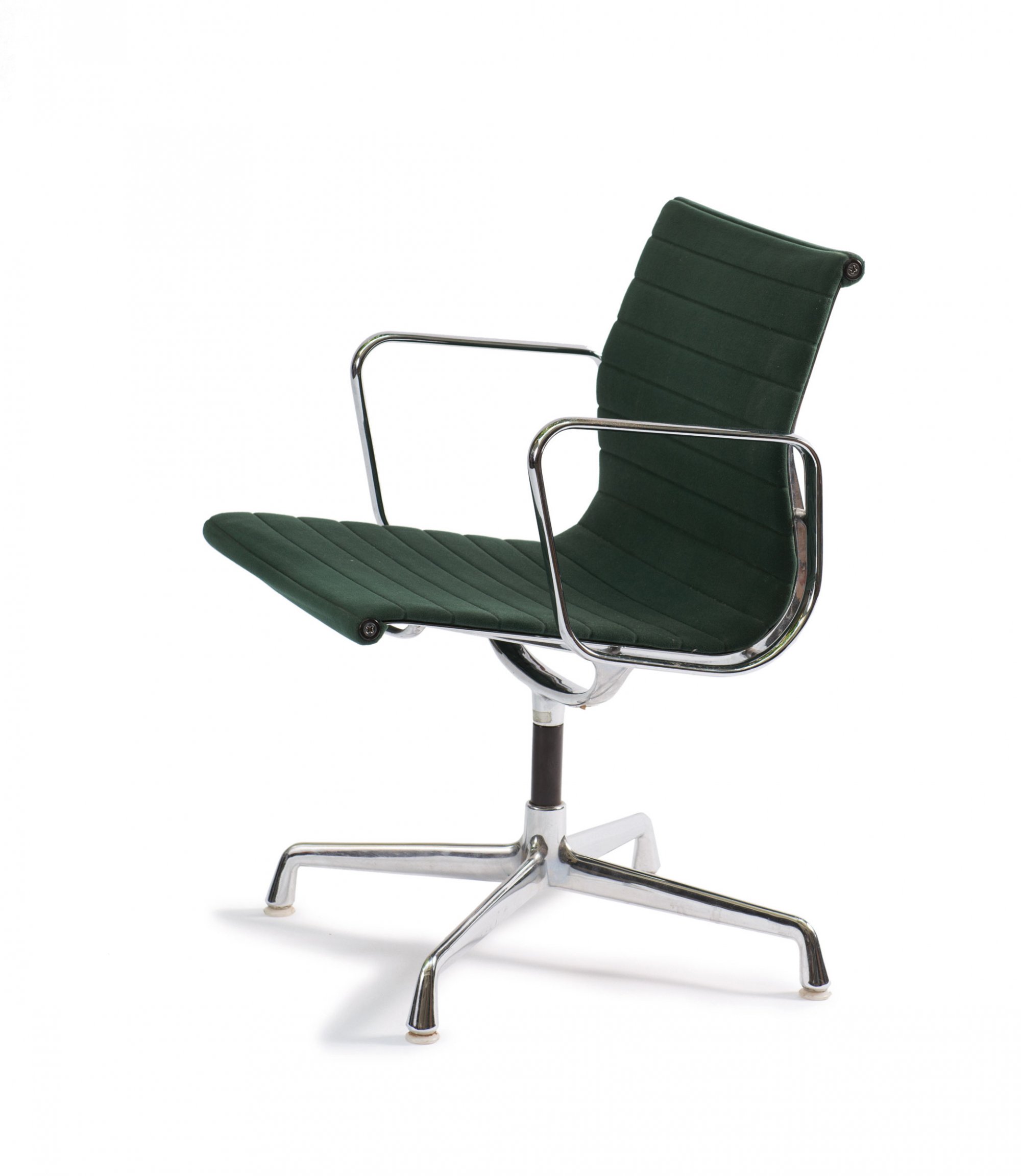 Charles Eames. 'Aluminium group' armchair, 1958. H. 83 x 56 x 61.5 cm. Made by Herman Miller, Zeeland. Chrome-plated cast aluminium, tubular steel, dark green fabric. Marked: Maker's mark M, distributor's decal vitra, another decal.