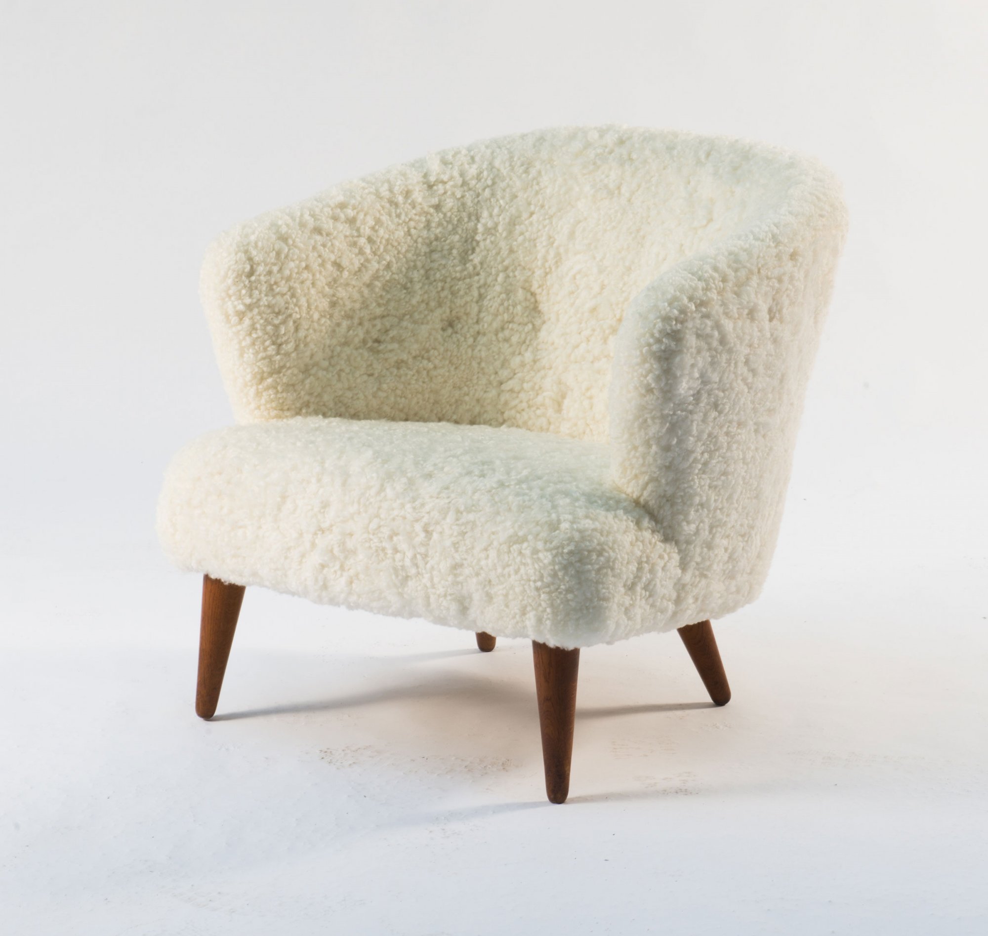 Flemming Lassen (attributed). Armchair, 1940s. H. 73 x 76 x 70 cm. Made by Jacob Kjaer, Copenhagen. (attributed). Oak, dark patina, sheep skin.