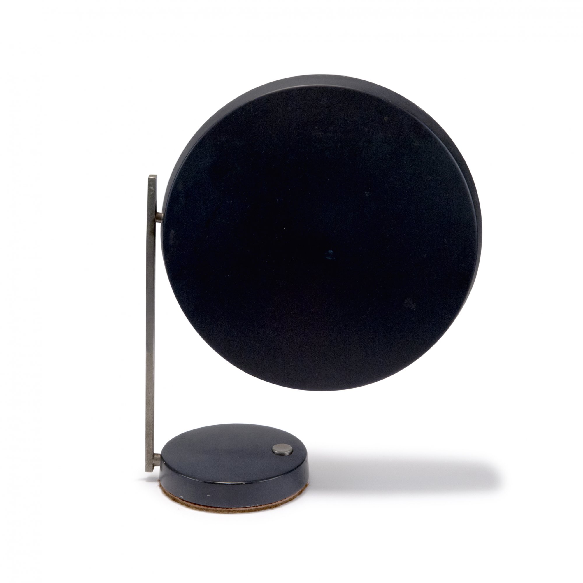 Heinz G. Pfaender. 'Oslo' table light, 1961. H. 40 cm (max.), D. 30 cm. Made by E. Hillebrand, Neheim-Hüsten. Sheet metal, painted black, rectangular metal. Marked: Maker's label Hillebrand.