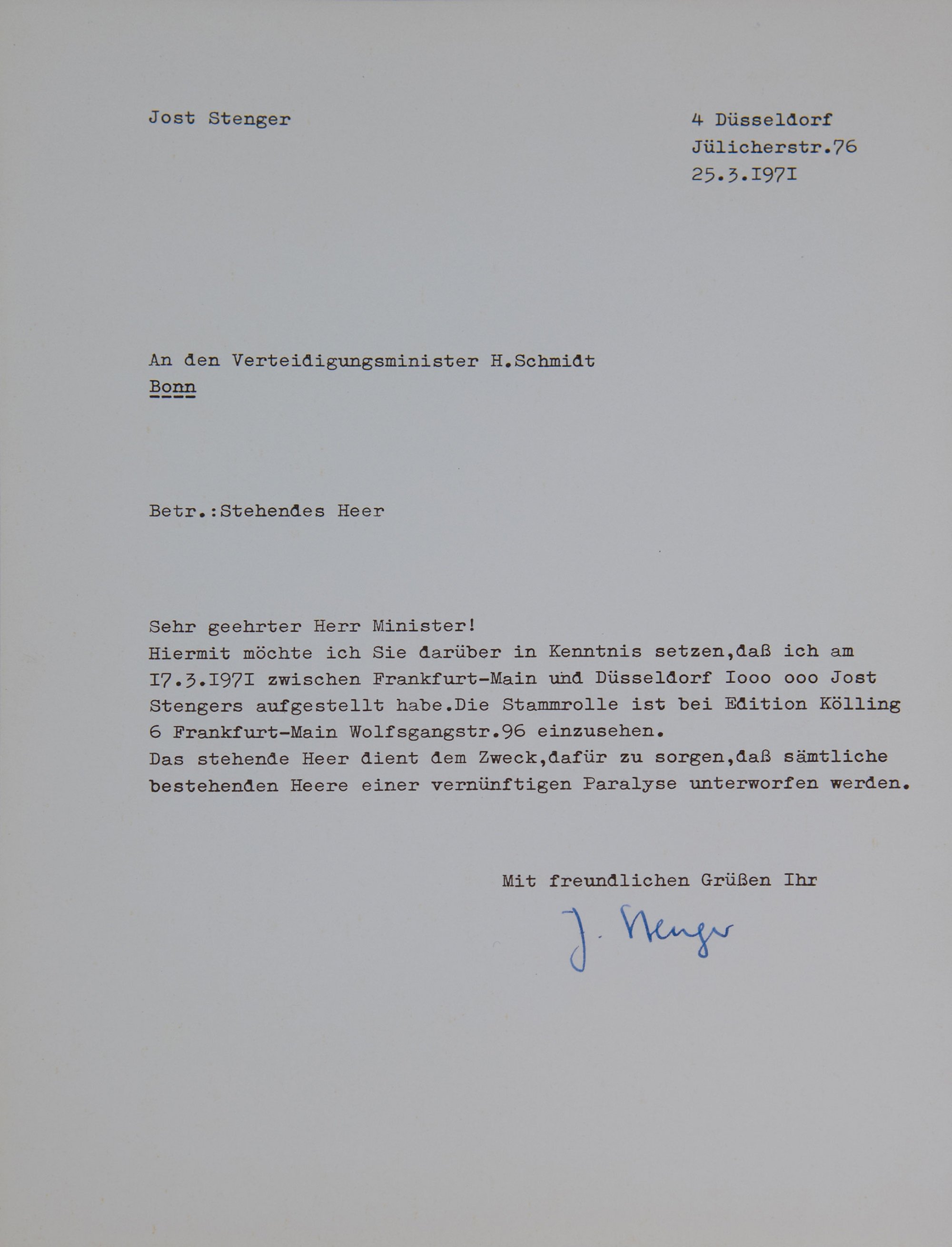 art intermedia - edition. 'Marksgrafik', 1972. 10 works. Offset lithographs and serigraphs by Joseph Beuys, K. P. Brehmer, Michael Buthe, Hubertus Gojowczyk, Bernd Koberling, Ernst Mitzka, Siegfried Neuenhausen, Géza Perneczyky, Brigitte Reinert, Jost Stenger. Signed. One from an edition of 1000.