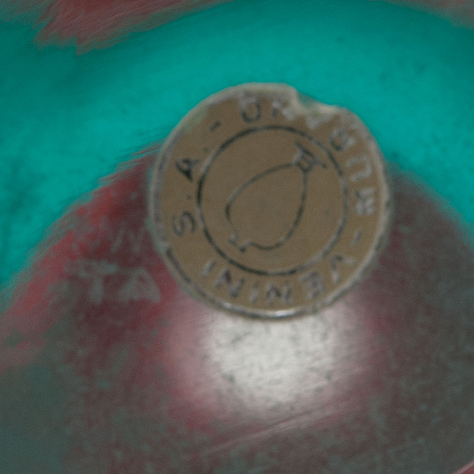 Fulvio Bianconi. 'A fasce orizzontale' vase, 1953. H. 33 cm. Made by Venini & C. Cased glass, clear and green, two applied ribbons, red and white. Upper end red. Marked: venini murano ITALIA (acid stamp), maker's paper decal.