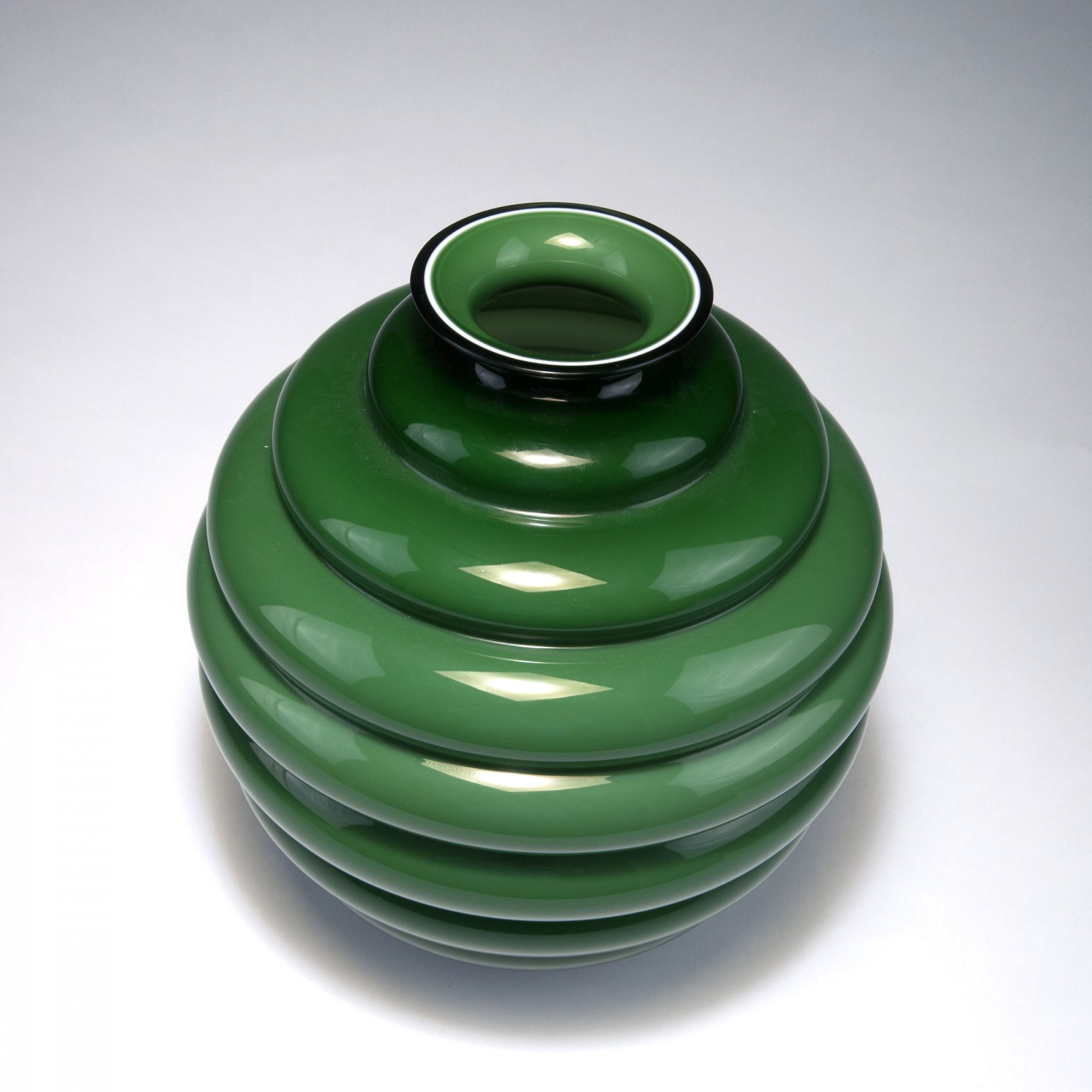 Napoleone Martinuzzi. Vase, 1930. H. 30 cm. Made by Venini & C., in 1995. Cased glass, clear, white and moss green. Marked: venini 95 Carlo Scarpa (sic!).