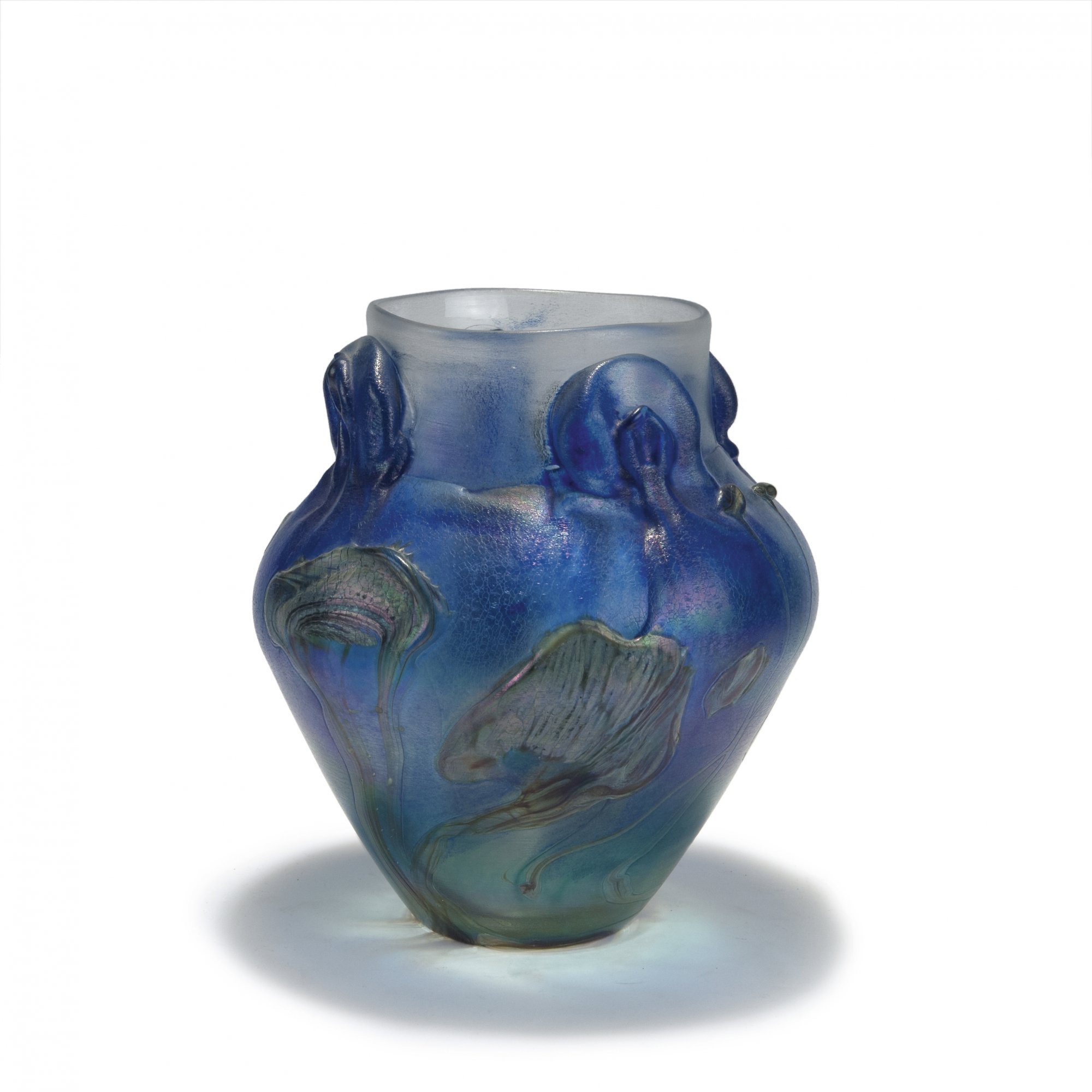 Jean-Claude Novaro. Vase, 1985. H. 24.7 cm. Cased glass, clear, blue powder inclusions, reliefed applications, fused pattern with buds and leaves, combed threads of opaque greenish oxides, surface with strong matt petrol lustre. Signed: Novaro, sc NOVARO 1985.