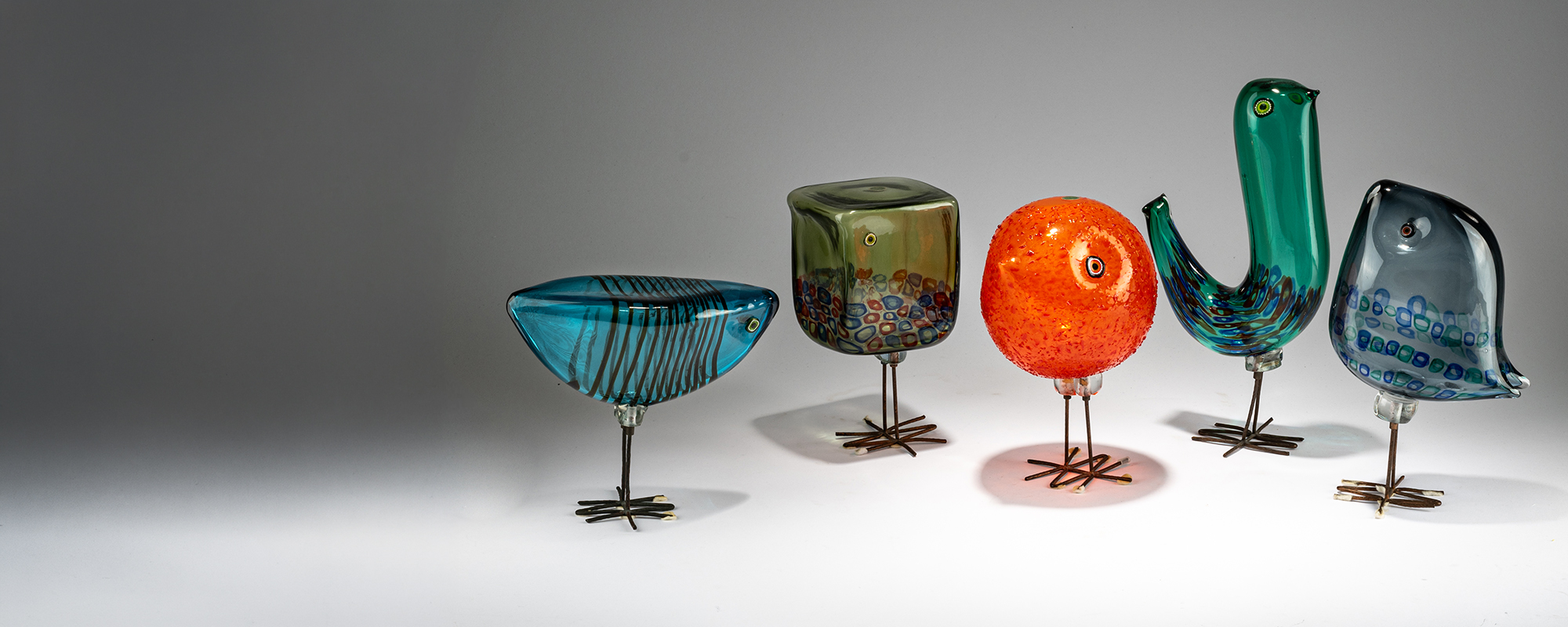 In addition to several lamp designs for various manufacturers and vases for the Vistosi factory, Alessandro Pianon became famous for a very special creation. He created a series of five models of birds, known as ‘Pulcini’ (Italian for ‘chicks’). They all have different shapes and colors and stand on spindly copper wire legs. When individual Pulcini appear, they always trigger fierce bidding wars, and their prices have risen significantly in recent times. A complete set of five is coming up for auction with an estimated price of €25,000–30,000.