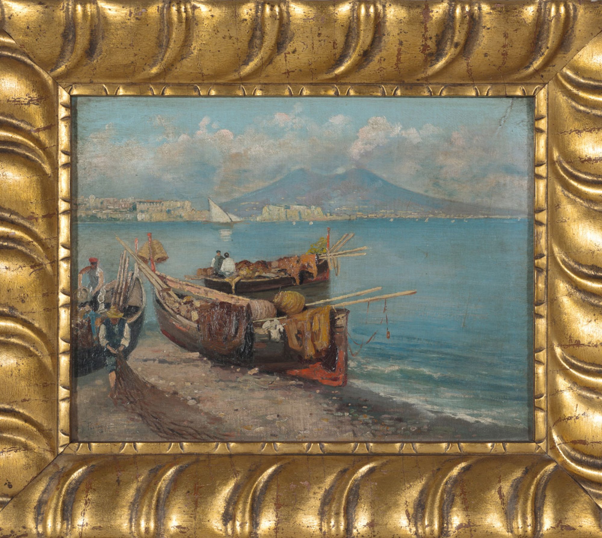 G. Puco. Bay of Naples with Mount Vesuvius in the background, 20th century. 26.0 x 35.0 cm (canvas), 28.0 x 36.5 cm (cardboard). Oil on canvas, mounted on cardboard. Signed: G. Puco, inscribed (illegible). Frame.
