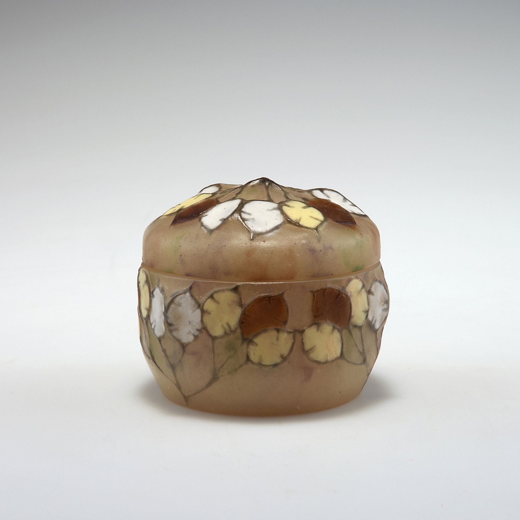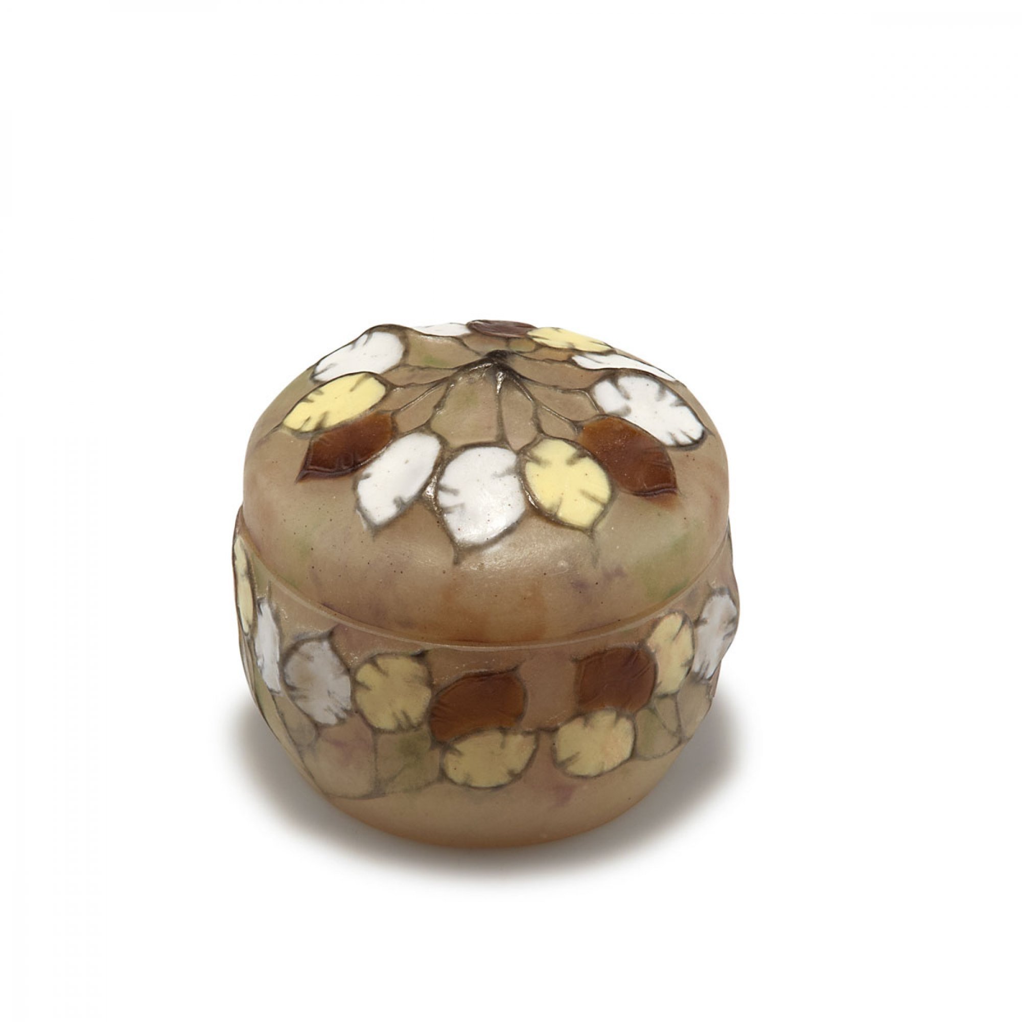 Gabriel Argy-Rousseau, Paris. 'Monnaie du Pape - Honesty', covered vase, 1920. H. 8.5 cm; D. 9.3 cm. Pâte de verre, translucid gather, clear and slightly yellow. fused colours, yellow, brown and opaque white. Reliefed honesty. Signed: G. Argy-Rousseau, 8731.