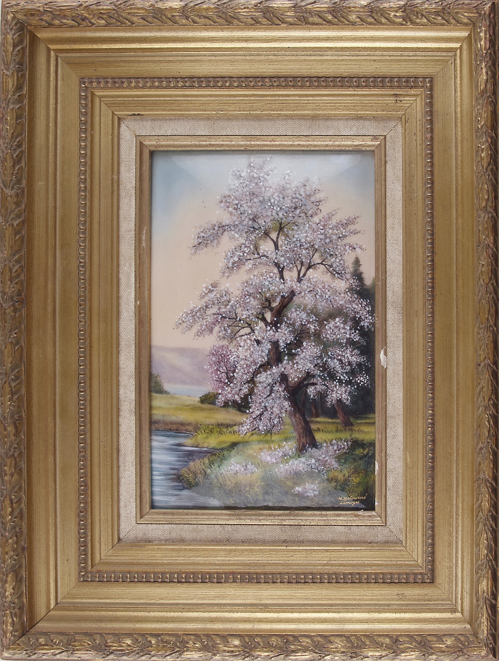 M. Betourné, Limoges. Shoreland, 1920s. 24.5 x 16.5 cm. Sheet copper, polychromatic enamel. Tree standing by a lake. Signed: M. Betourné, Limoges. Frame.