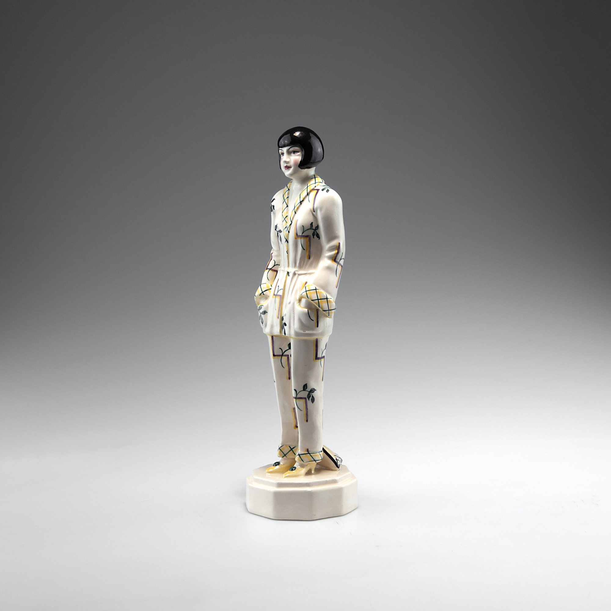 Wiener Kunstkeramischer Werkstätten Busch & Ludescher. Woman with bob, 1920s. H. 29 cm. Earthenware, polychromatic glaze on white. Marked: 2267, 2, AUSTRIA, maker's mark.