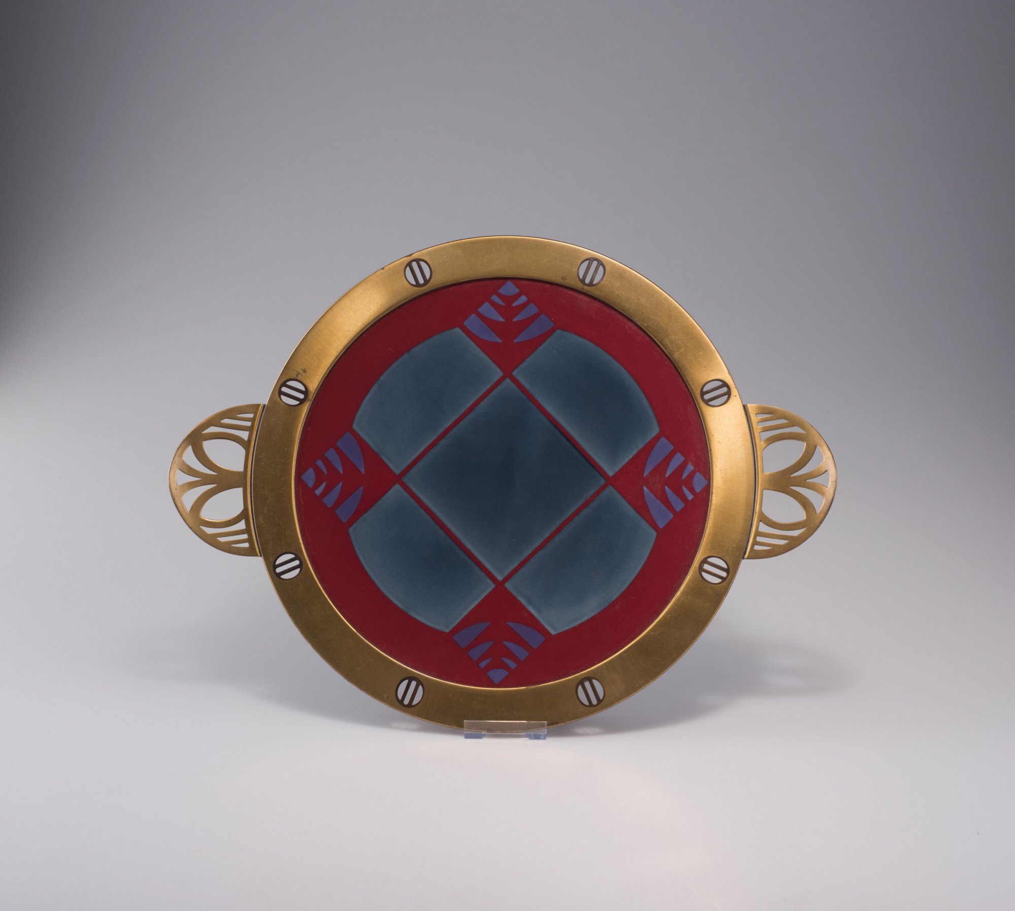 Wächtersbach, Schlierbach. Cake platter, c1906. 45.2 x 34.2 cm. Designed by Christian Neureuther. Earthenware, glazed grey blue, purple and raspberry red. Marked: Artist's signet, 922, GPN 5 1/2, maker's mark.