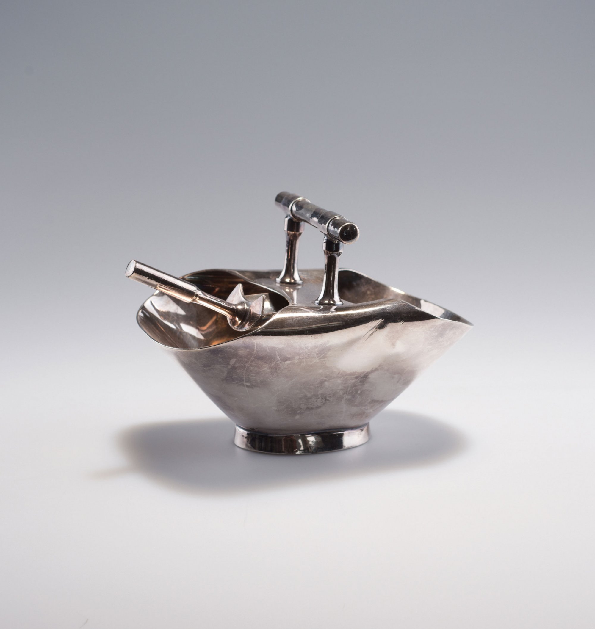 Christopher Dresser. Sugar pot with spoon, c1880. H. 11,5 cm; 16 x 10,6 cm. Made by Walker & Hall, Sheffield. Electro-plated brass. Marked: Maker's mark, WALKER & HALL SHEFFIELD, 1995 A, 76.