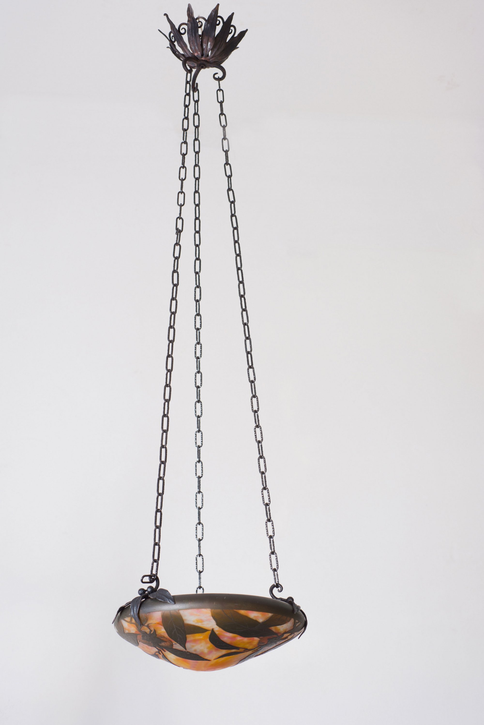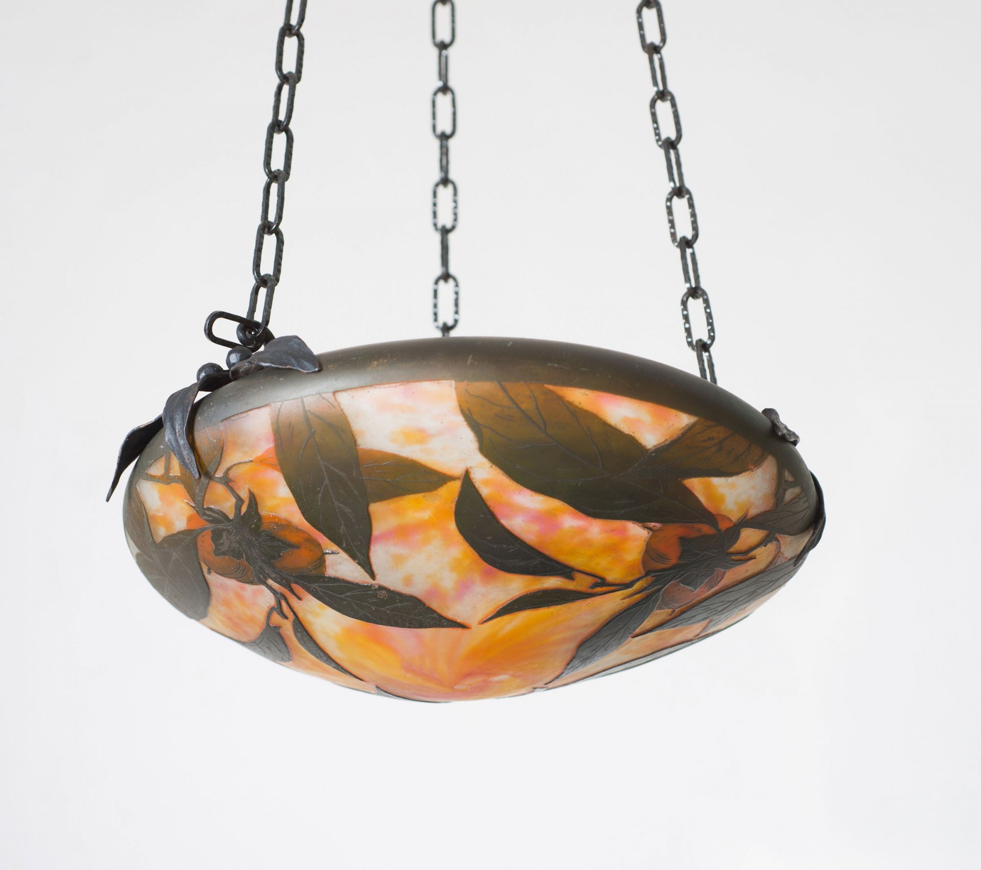 Daum Frères, Nancy. Ceiling light with kaki, c1915. D. 33 cm. Cased glass, clear, milky white, amber and claret red powder inclusions, dark olive enamel fusions. Multiply etched pattern, kaki twigs. Signed: Daum Nancy, cross of Lorraine. Wrought-iron mounting.