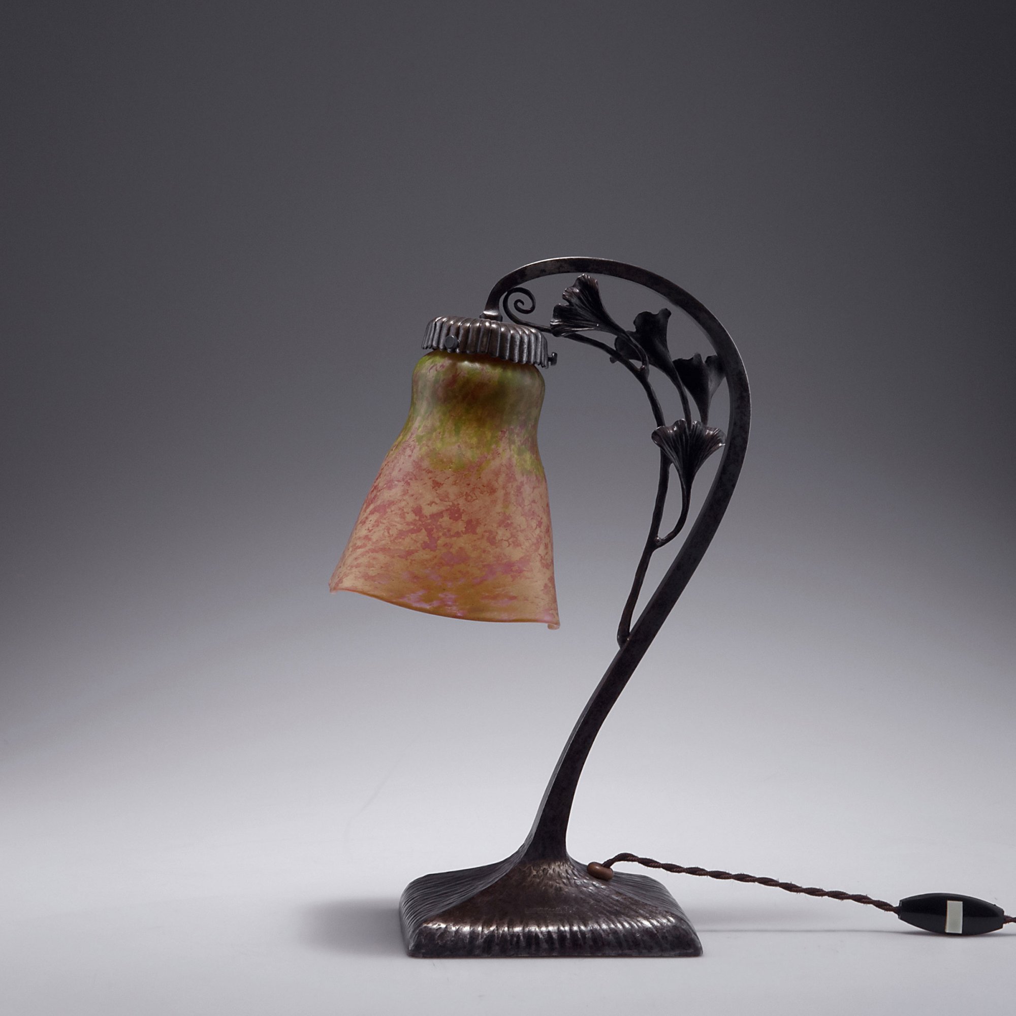 Daum Frères, Nancy. Table light, c1920. H. 35.5 cm. Wrought iron base, patina. Glass shade, clear, fused powders, green, orange and red. Shade signed: DAUM NANCY. Foot: LEGERFORGÉ HF.