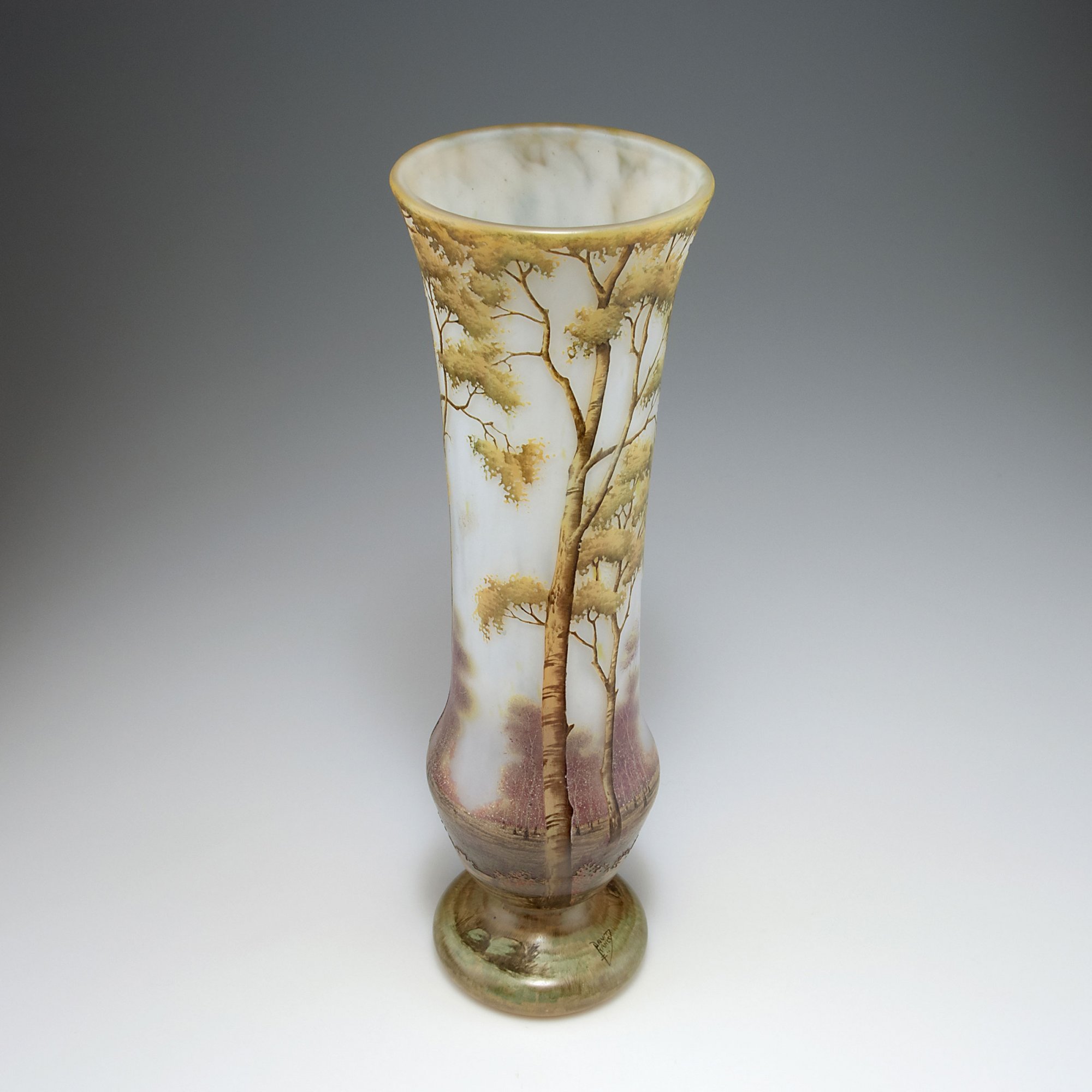 Daum Frères, Nancy. Large vase with meadowy landscape in late Summer, 1905-10. H. 39.1 cm. Cased glass, clear, milky powder inclusions. Etched and enamelled pattern, greenish and yellow, deep purple and red/brown. Birches. Signed: DAUM NANCY, cross of Lorraine.