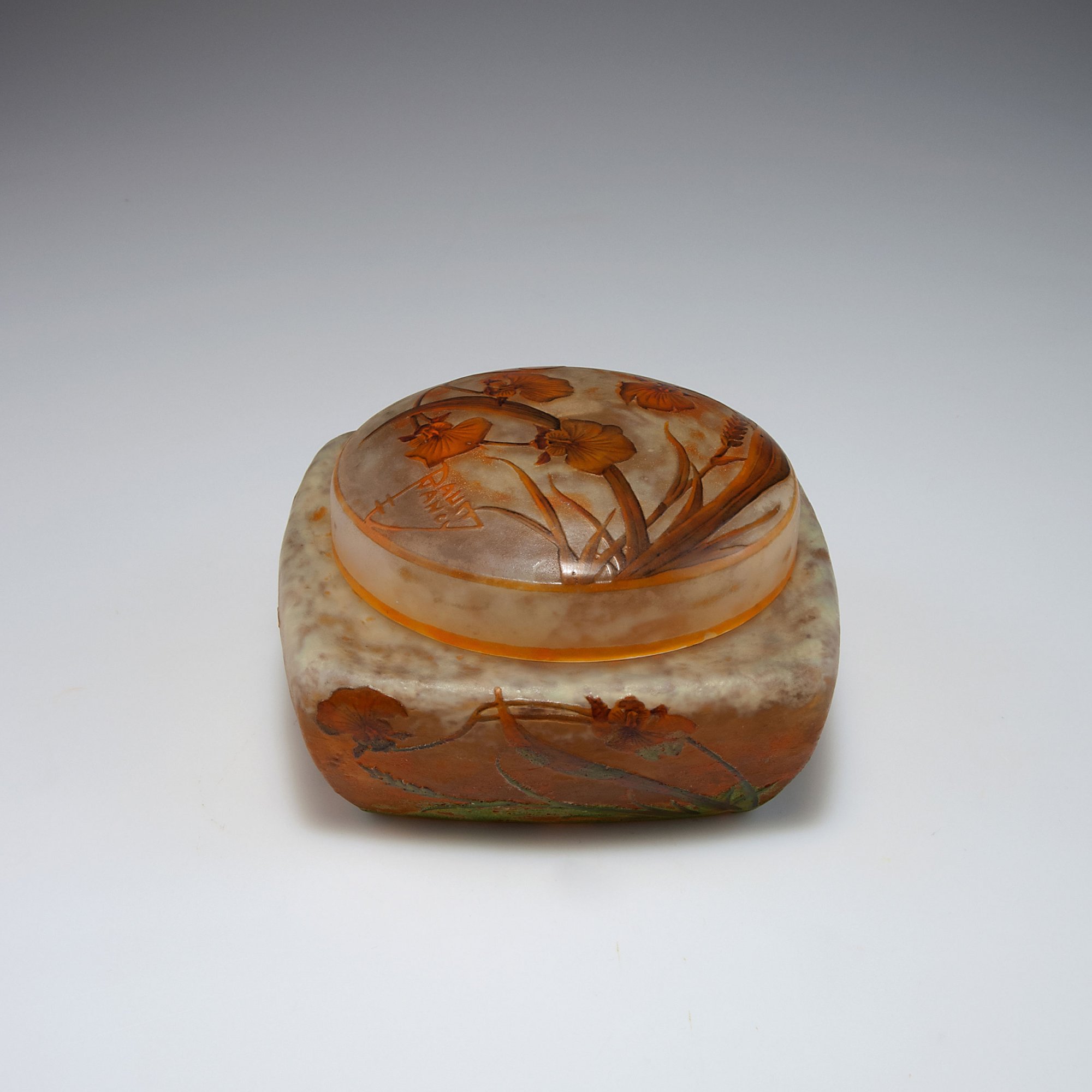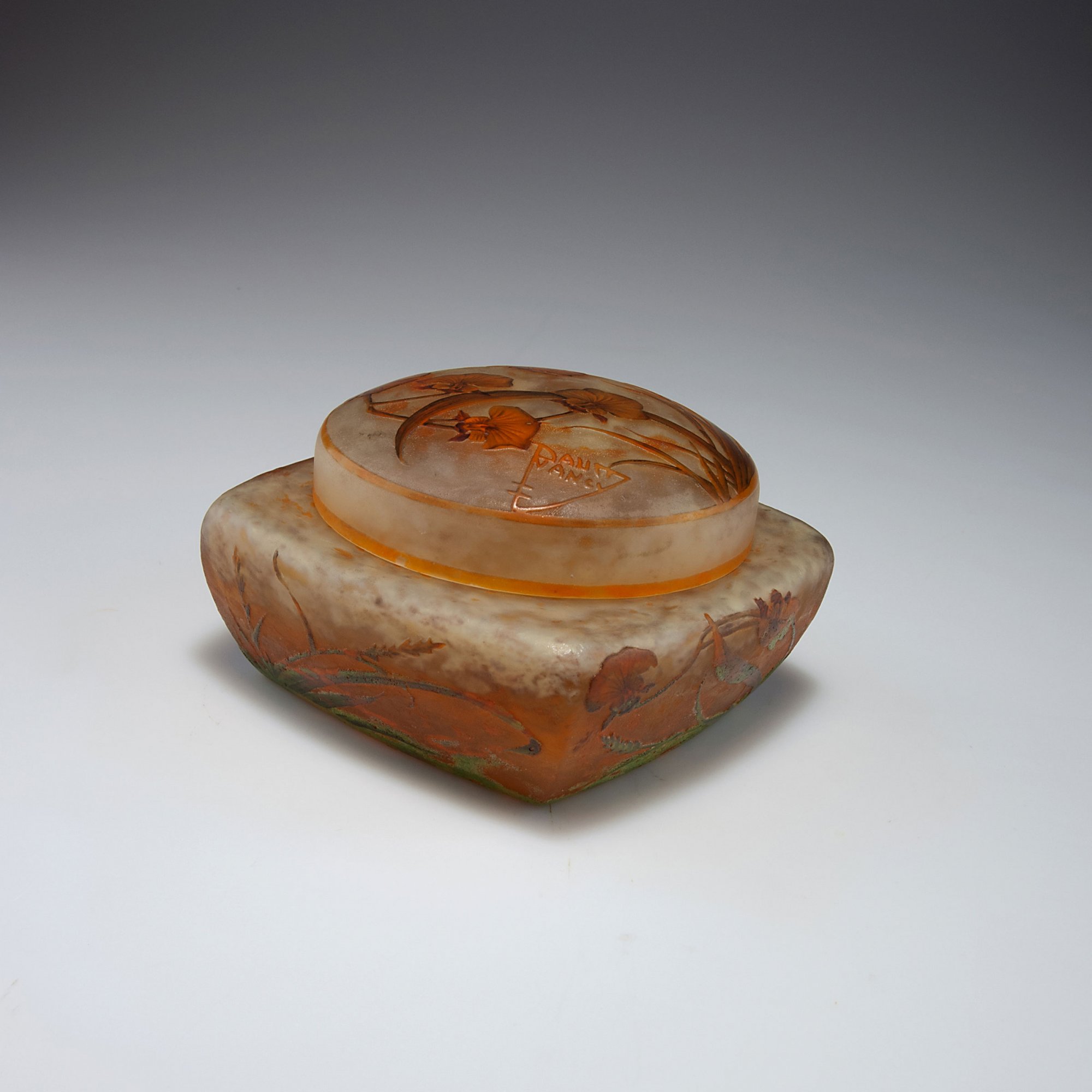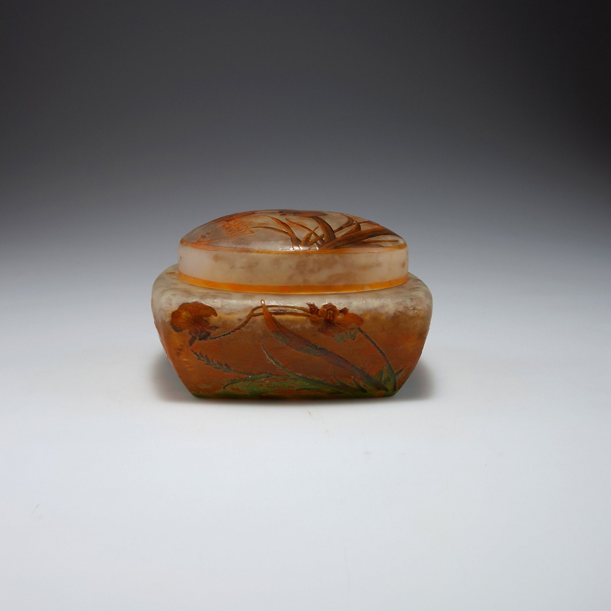 Daum Frères, Nancy. 'Orchidées' lidded box, c1905. H. 9.2 cm. Cased glass, cloudy whitish and light-yellowish, orange powder inclusions in the lower part, dark-green/rusty-brown enamel fusions (vitrifications), etched pattern with different kinds of grass and wild Orchids, buds partly enamelled. Signed: DAUM NANCY, cross of Lorraine.