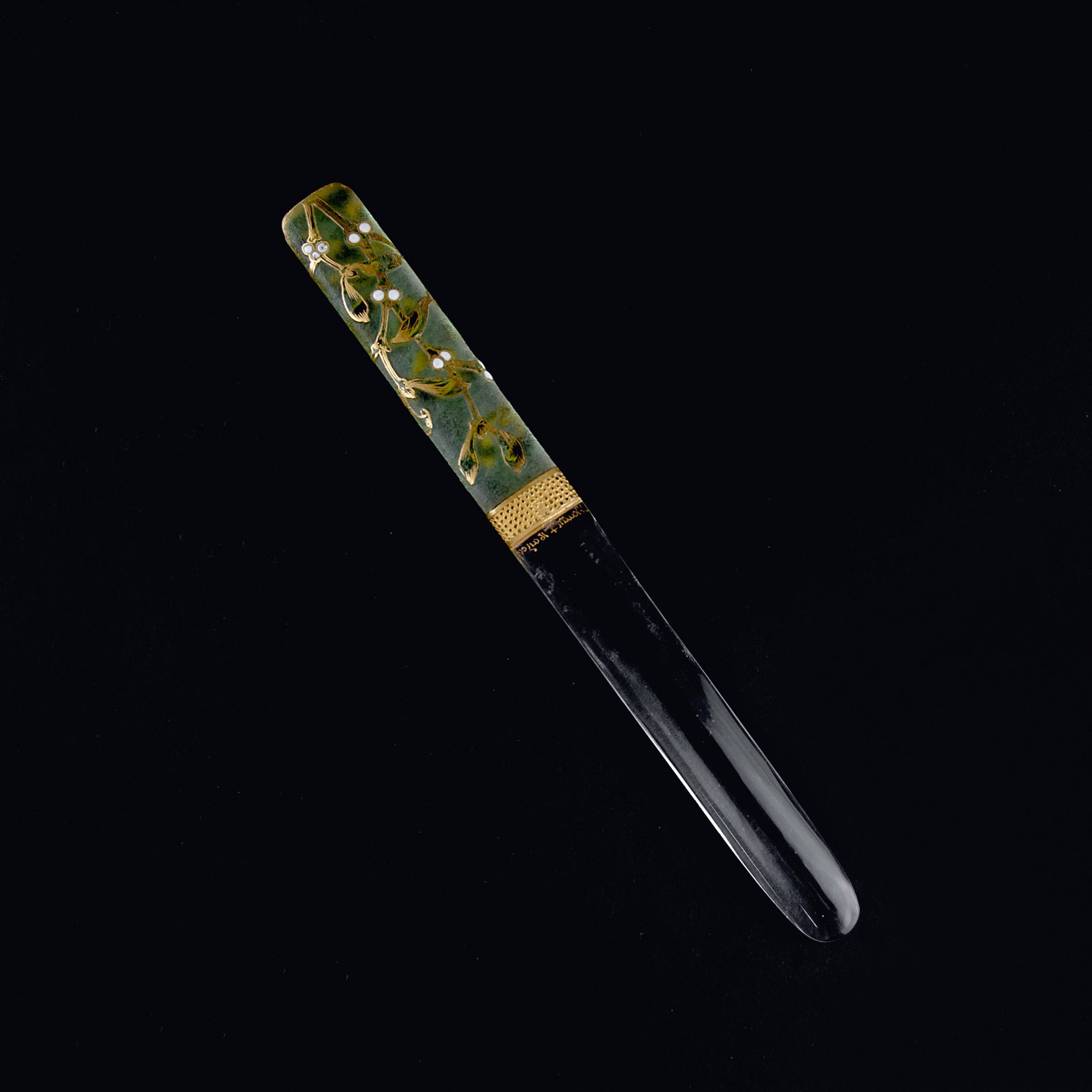 Daum Frères, Nancy. 'Gui' paper knife, c1894. L. 20.5 cm. Cased glass, clear and green. Mistle-toe, gold hue, white enamel on rough ground. Signed: Daum Nancy, cross of Lorraine.