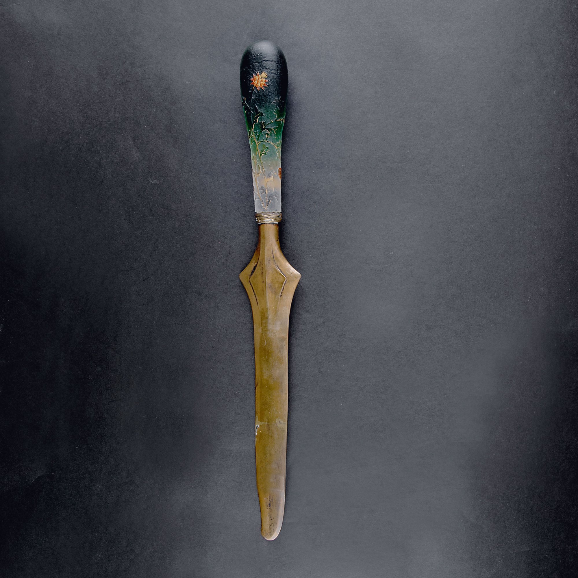 Daum Frères, Nancy. 'Chardons' paper knife, c1895. L. 30.7 cm. Glass, green and clear, multiply etched pattern with thistle, gold hue, enamel. Signed: Daum Nancy, cross of Lorraine. Blade of brass.