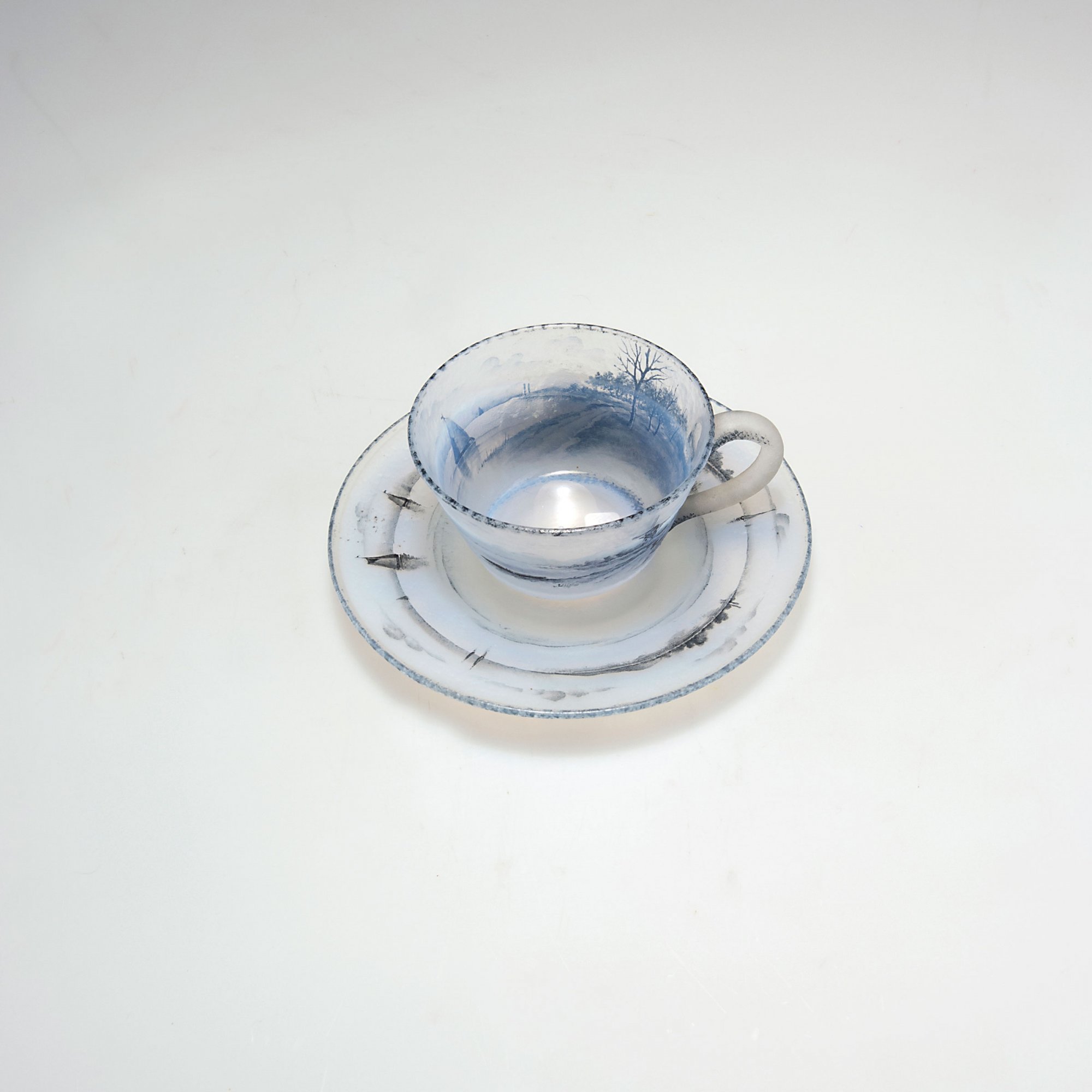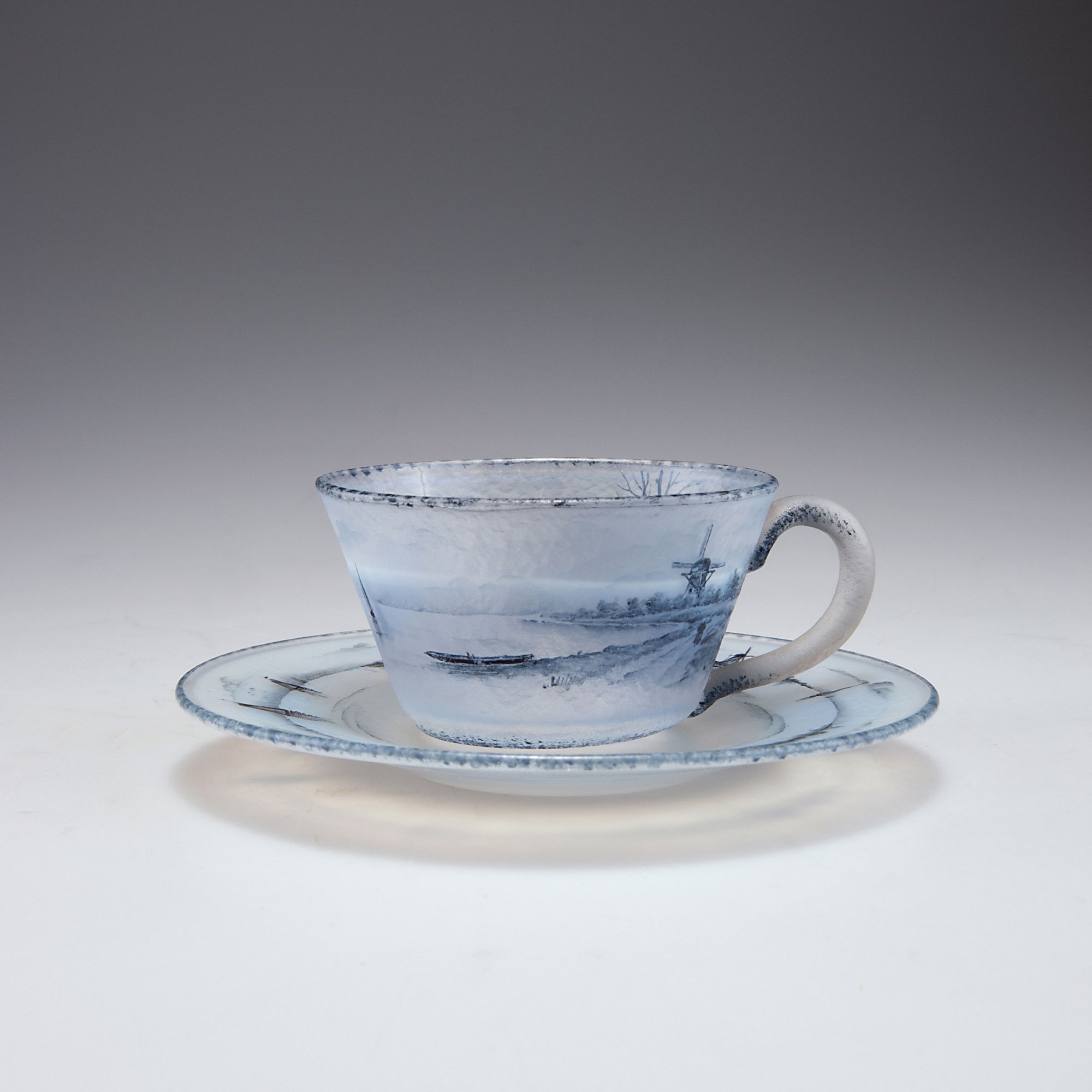 Daum Frères, Nancy. 'Delft' cup and saucer, c1899. H. 5.5 cm (together); saucer: D. 13.5 cm. Cased glass, opalescent and clear. Fine 'Delft' grisaille paint on etched ground. Signed: Daum Nancy, Cross of Lorraine.