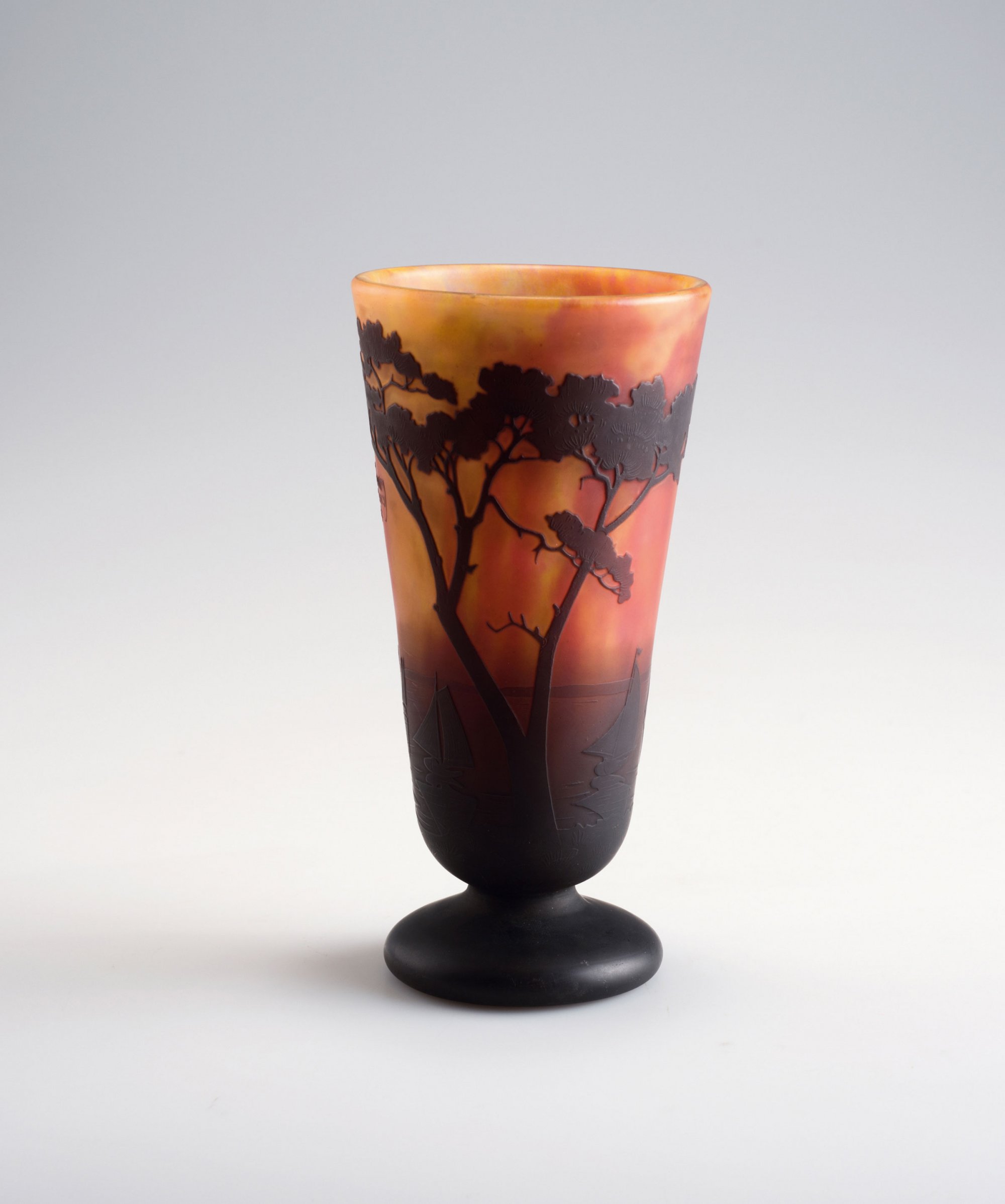 Daum Frères, Nancy. Vase with coastal landscape, c1905. H. 20.1 cm. Clear glass, included powders, red and yellow, dark purple layer. Etched Mediterranean landscape at dusk. Marked: DAUM NANCY, cross of Lorraine.
