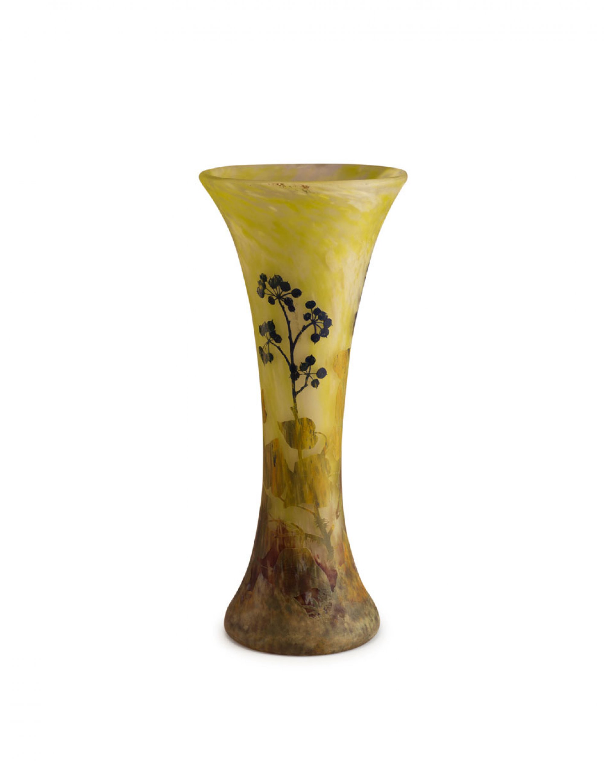 Daum Frères, Nancy. 'Je meurs ou je m'attache' vase, c1910. H. 48.8 cm. Cased glass, clear, green and brown powder inclusions. Blue, yellow, amber and green enamel fusions. Multiply etched pattern with ivy. Marked: DAUM NANCY, cross of Lorraine, 1082.