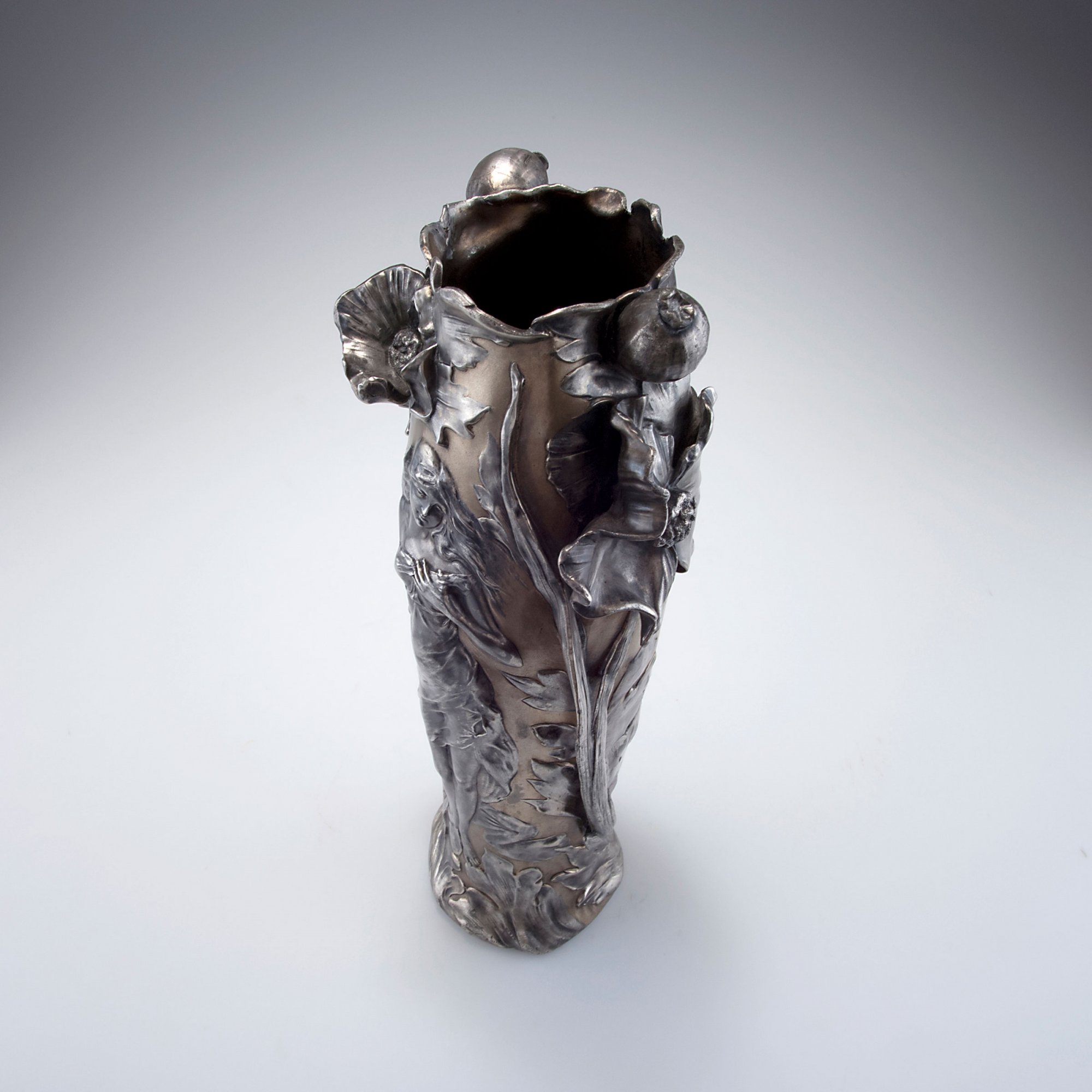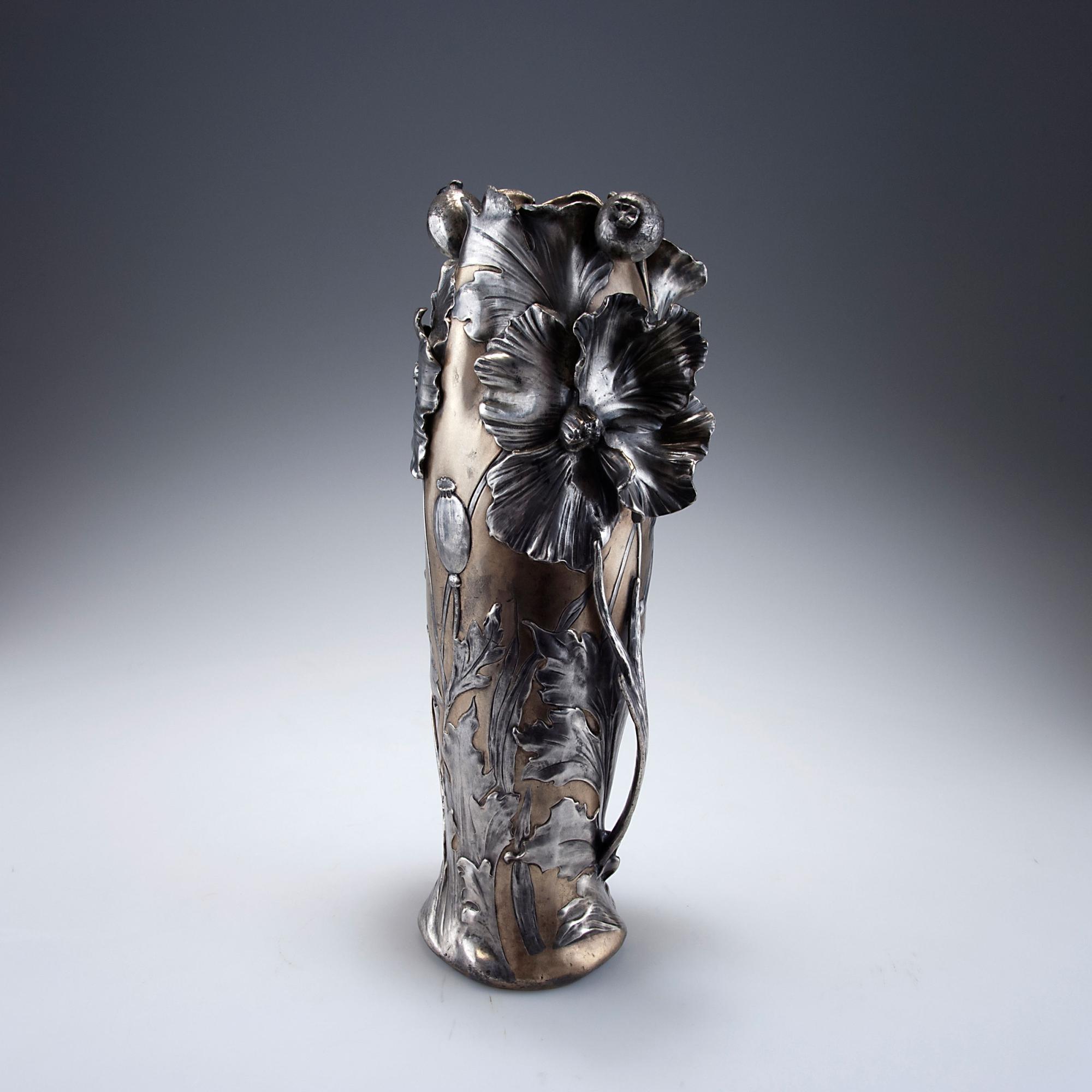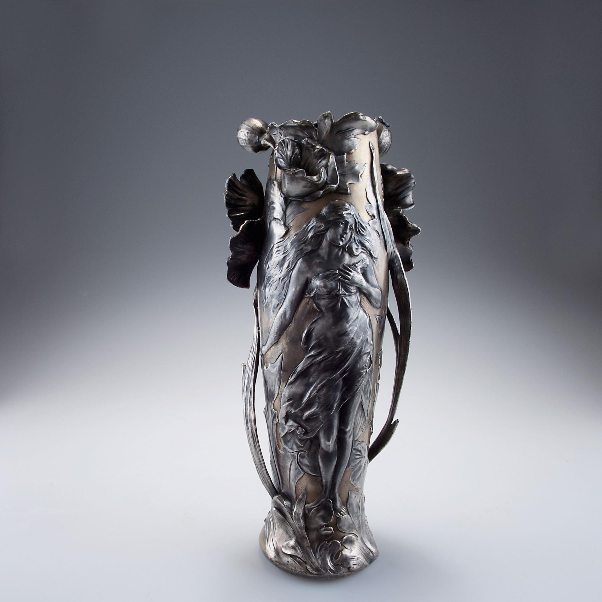 Germany. Vase, c1899. H. 35.6 cm. Pewter, part gilded, reliefed pattern with girl and poppies. Marked: 4500, K, F.