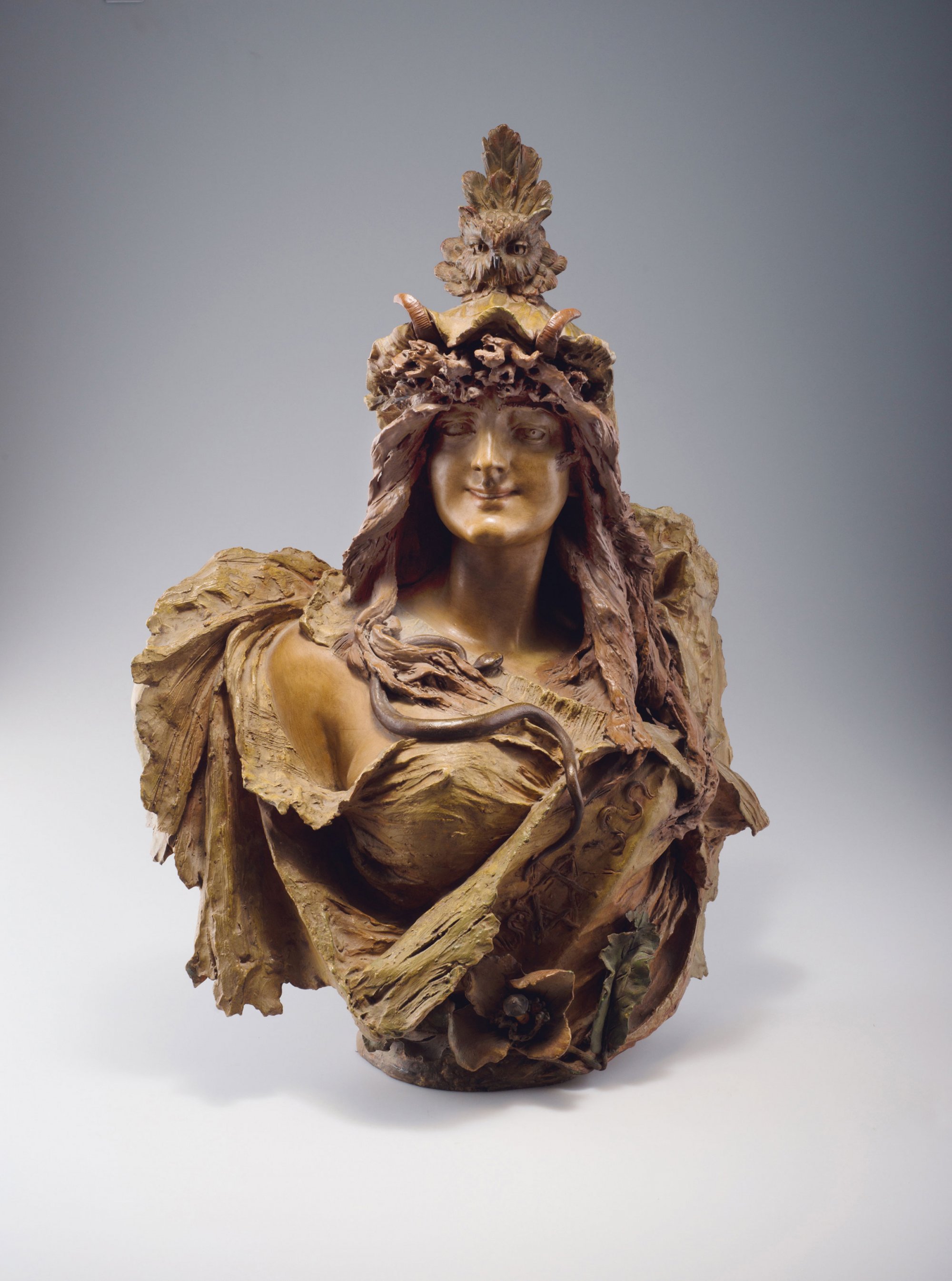 Amphora-Werke Riessner, Stellmacher und Kessel, Turn-Teplitz. 'Athena', 1898/99. H. 65.5 cm; 51 x 30 cm. Designed by Eduard Stellmacher. Ivory porcelain, glazed matt, brown, green and yellow, gold-hue. Marked: RStK, E. Stellmacher, 1550, remains of an original paper label.