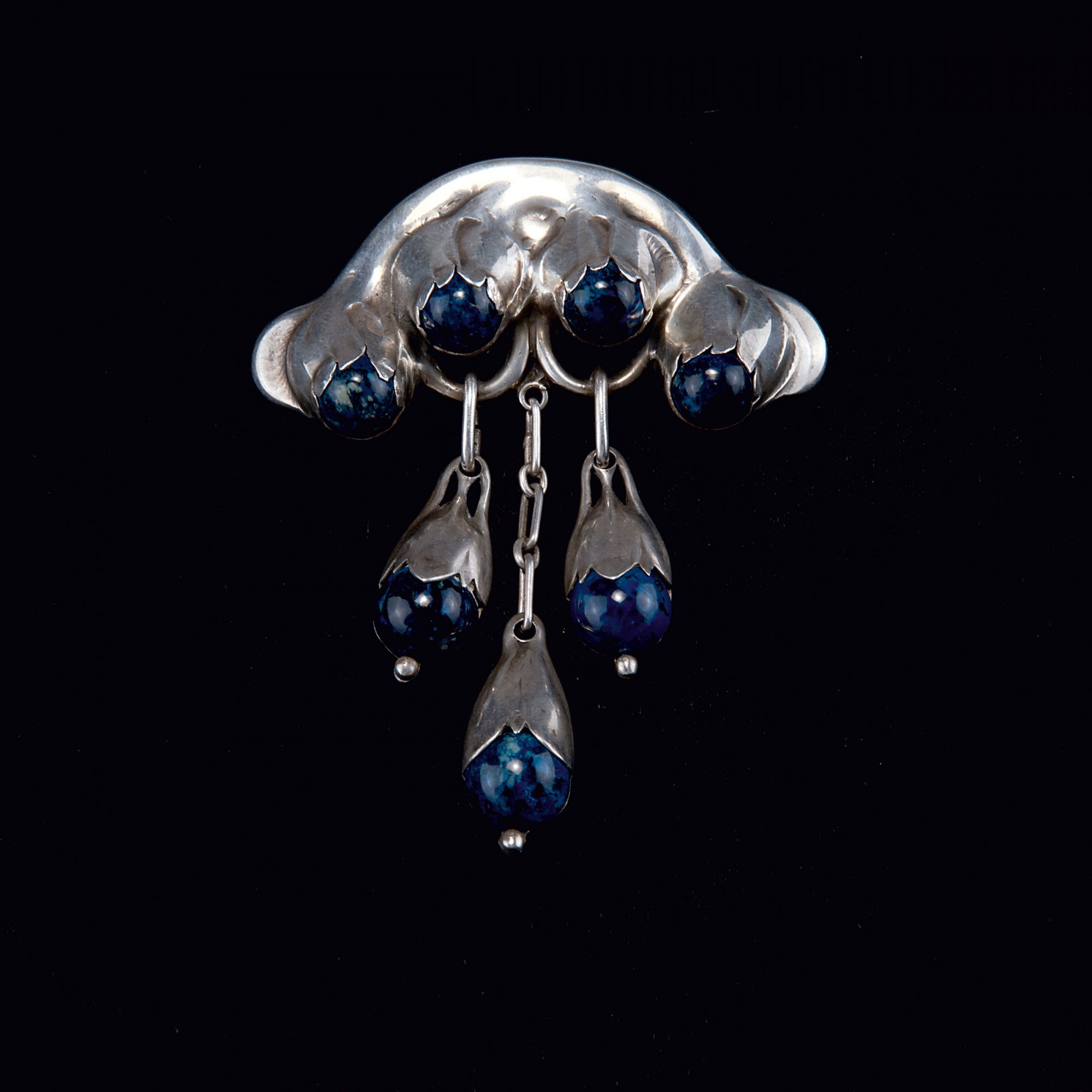 Evald Nielsen, Copenhagen (attributed). Brooch, c1910. 8.6 x 6.8 cm. Made by S. L. Jacobsen, Copenhagen. Silver, blue marbled beads. Marked: SJ 830 S.