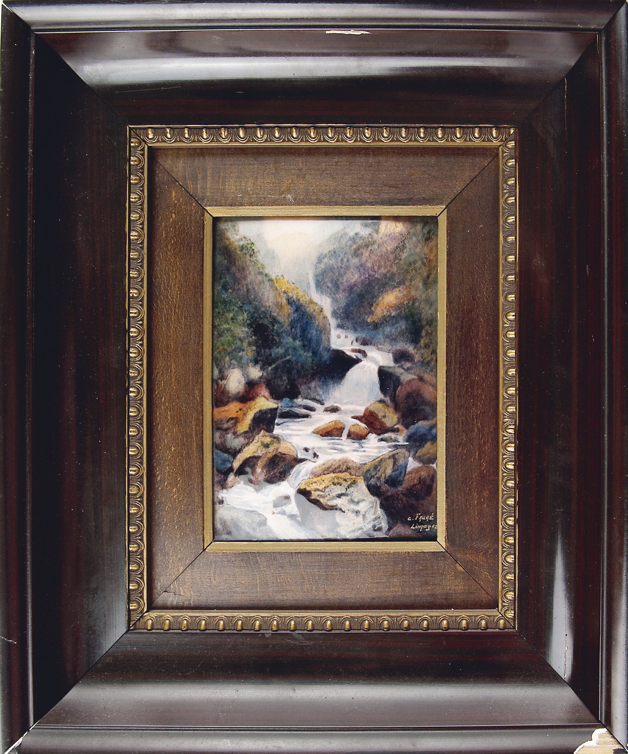 Camille Fauré, Limoges. Mountain river, c1925. 16.2 x 11.5 cm. Sheet copper, polychromatic enamel. Signed: C. FAURE Limoges. Frame.