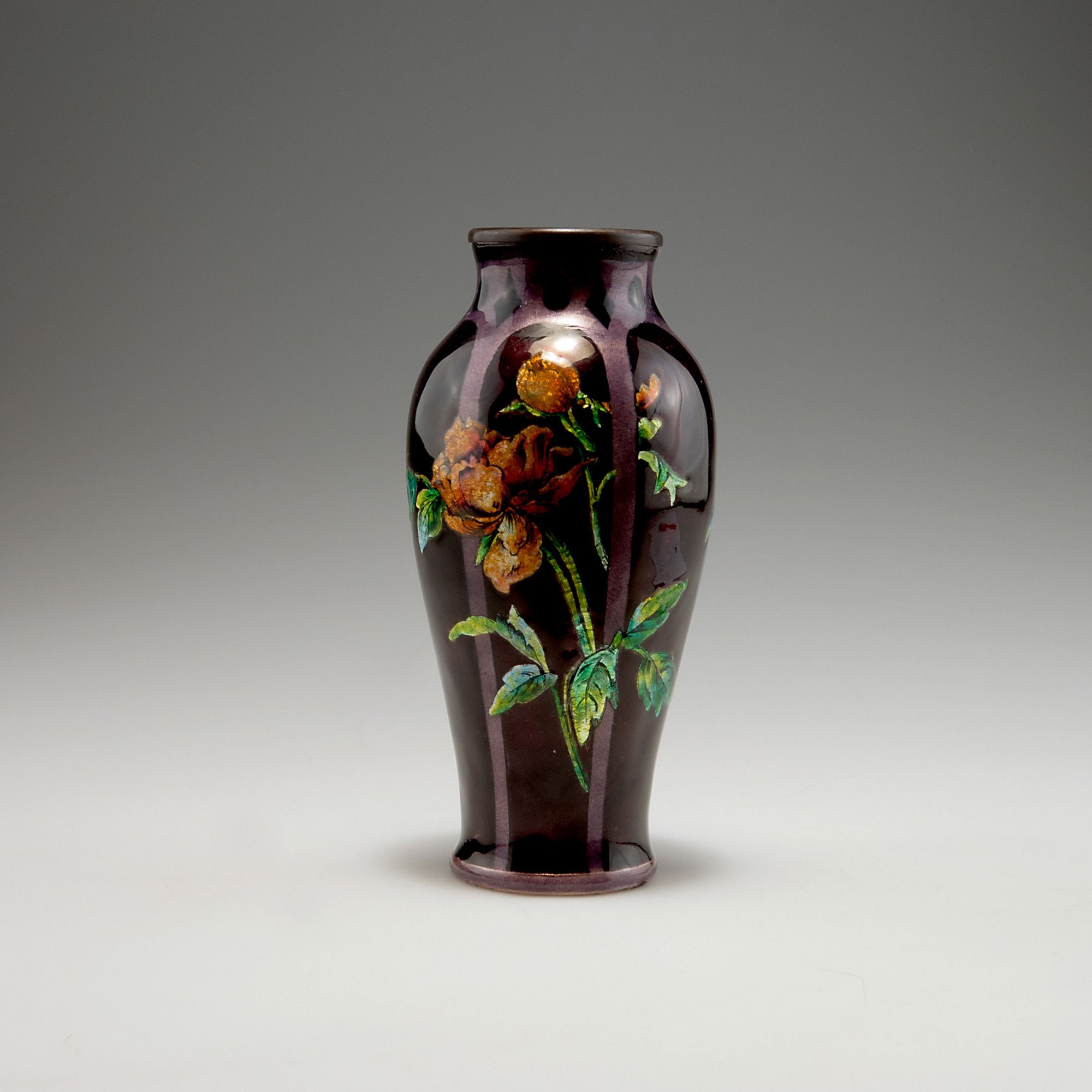 Camille Fauré, Limoges. Vase, 1920s. H. 18.8 cm. Sheet copper, applied metal foil, enamel, green and orange on purple. Signed inside: C. FAURÉ Limoges.