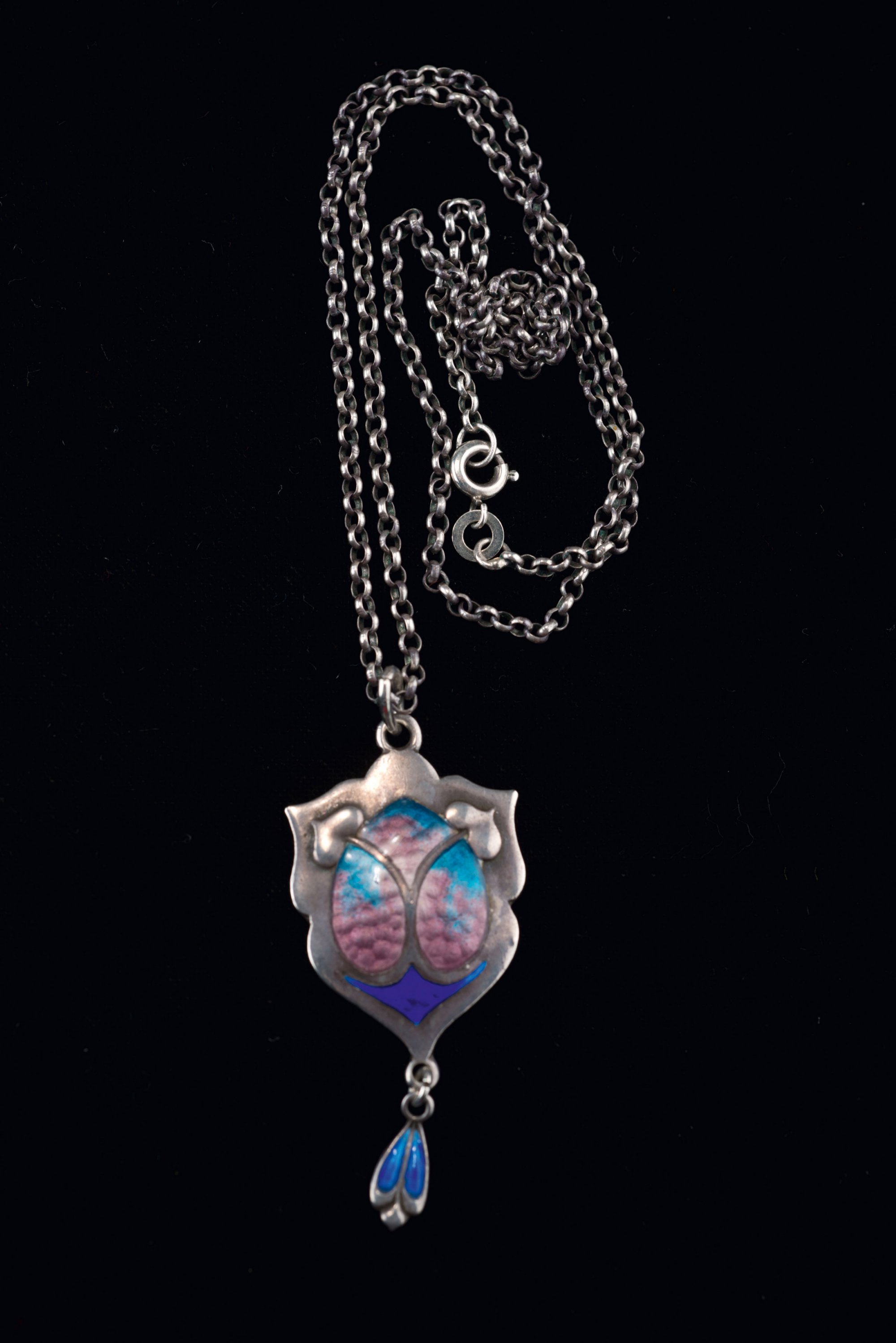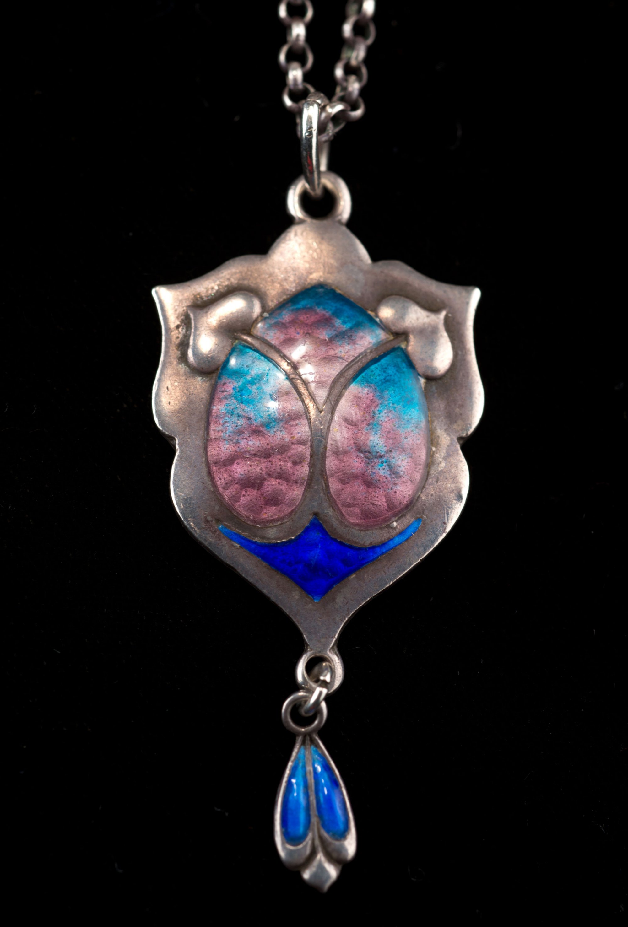 James Fenton, Birmingham. Pendant, 1908. 4.7 x 2.1 cm. Silver, pink and blue enamel. Marked: Maker's mark, anchor, date mark i.