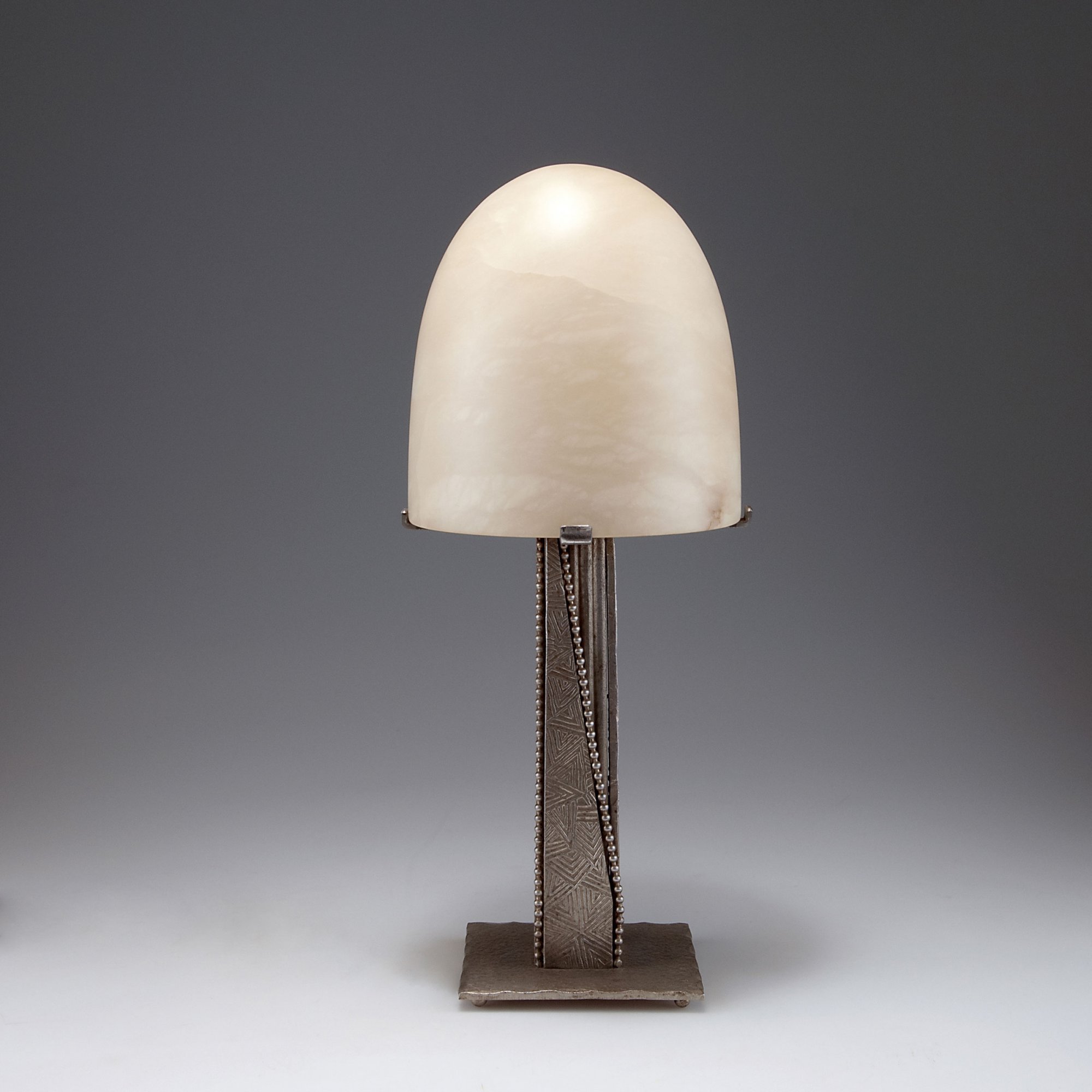 France. Table light, c1930. H. 41.3 cm; D. 17.5 cm. Wrought-iron, silver patina. Alabaster shade.