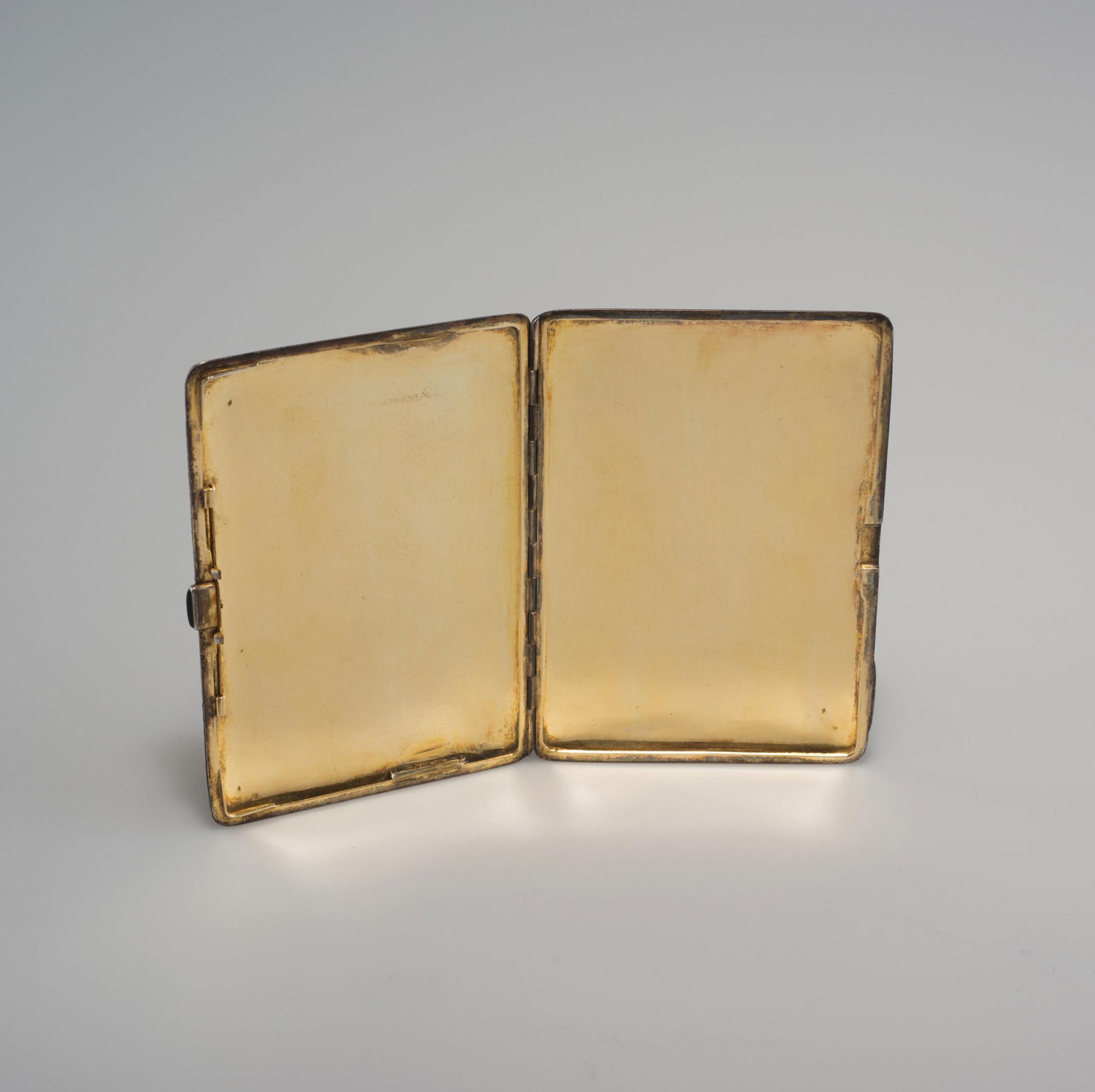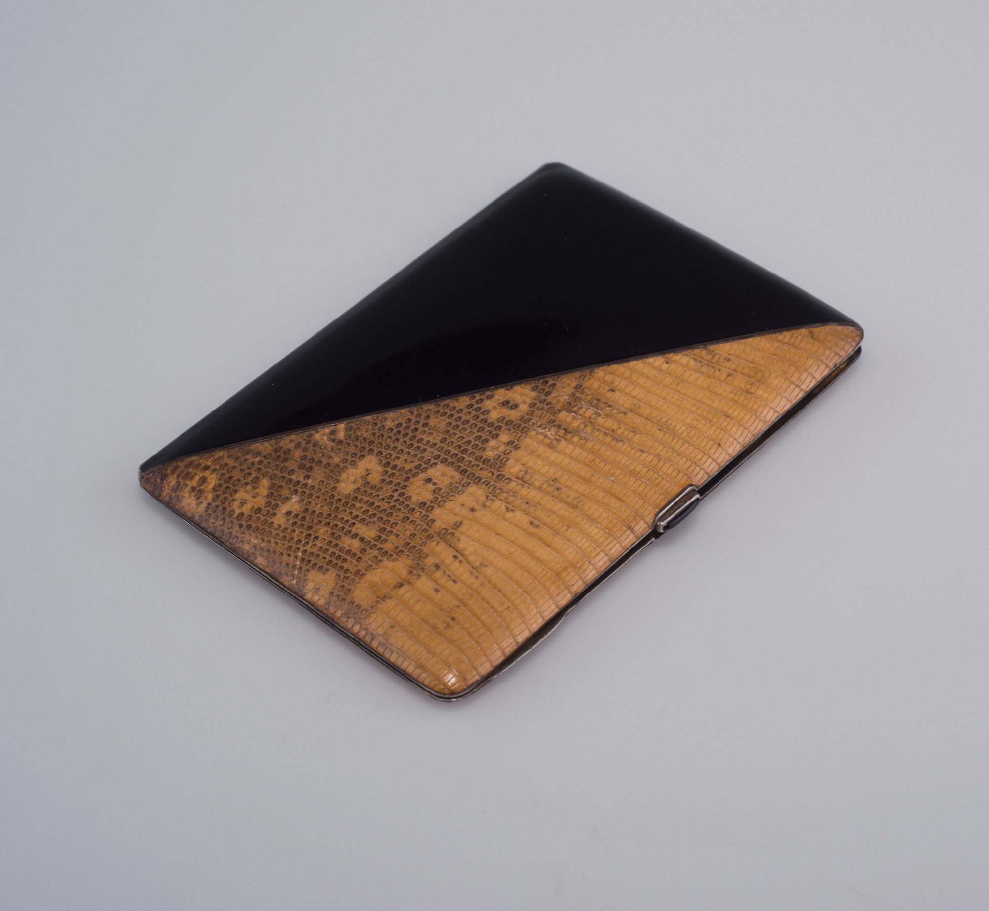 France. Cigarette case, c1925. 12.5 x 9 cm. Silver, gilded, black lacquer, cobra leather, black onyx. Marked: Maker's mark in a lozenge, boar's head.