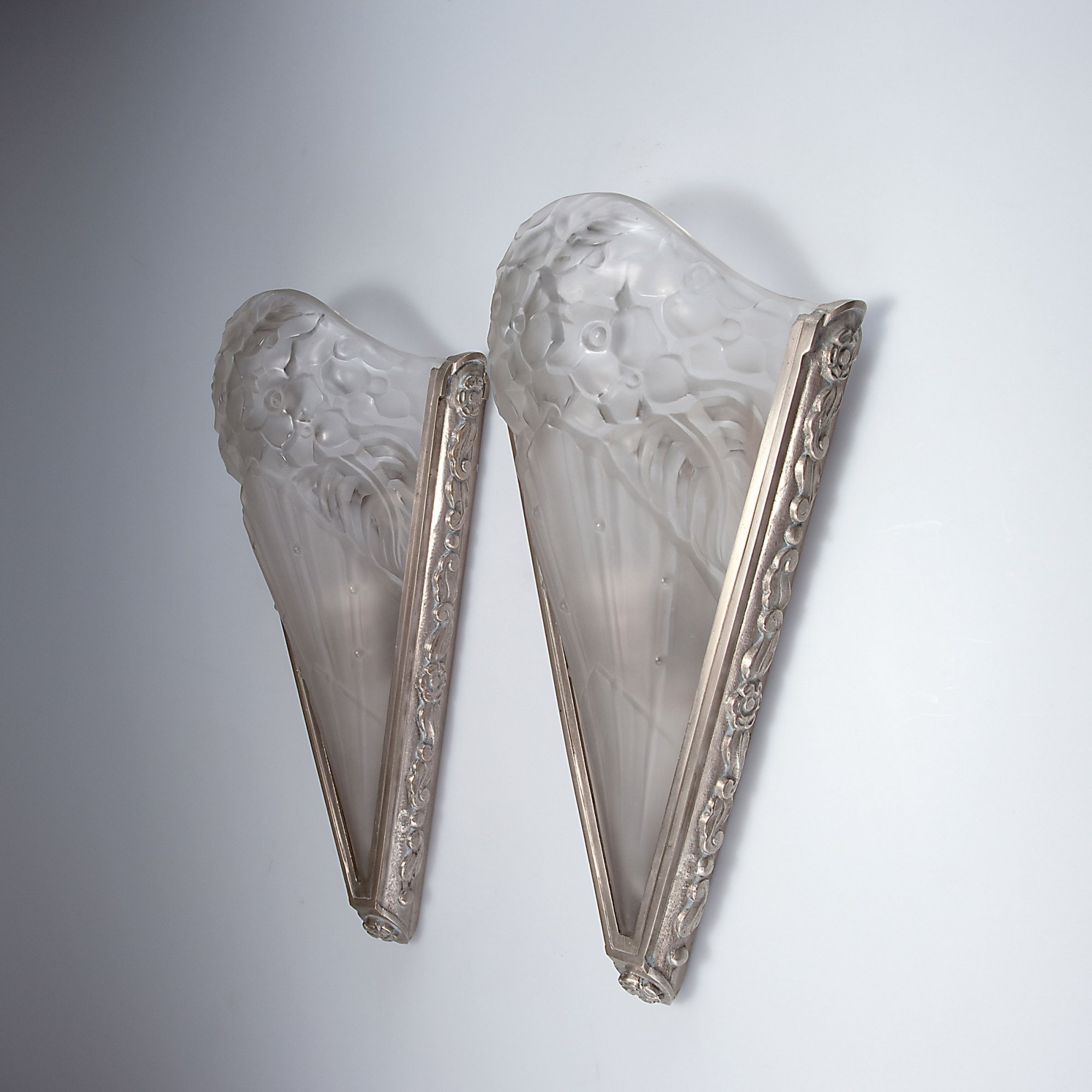 France. Pair of sconces, c1930. H. 35 cm. Clear moulded glass, reliefed flower pattern, part matted. Nickel-plated brass mounting.
