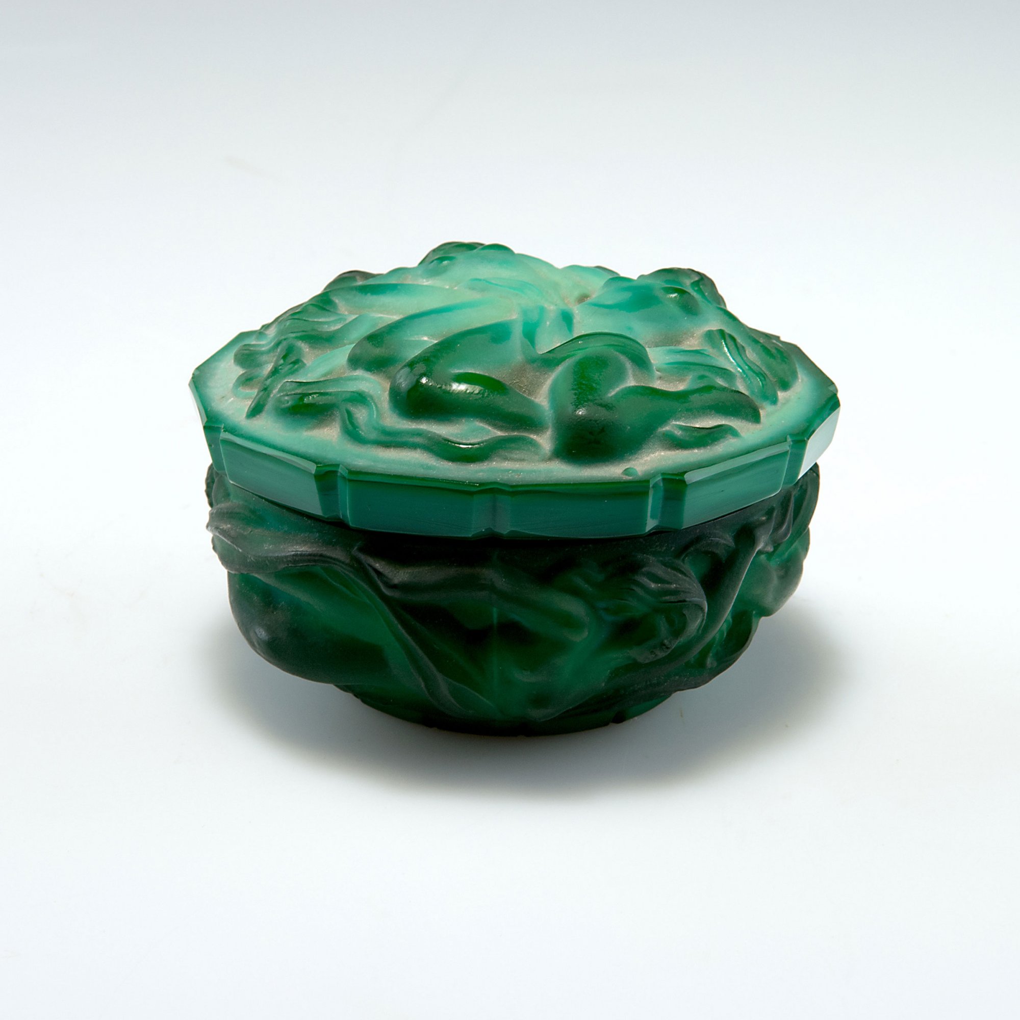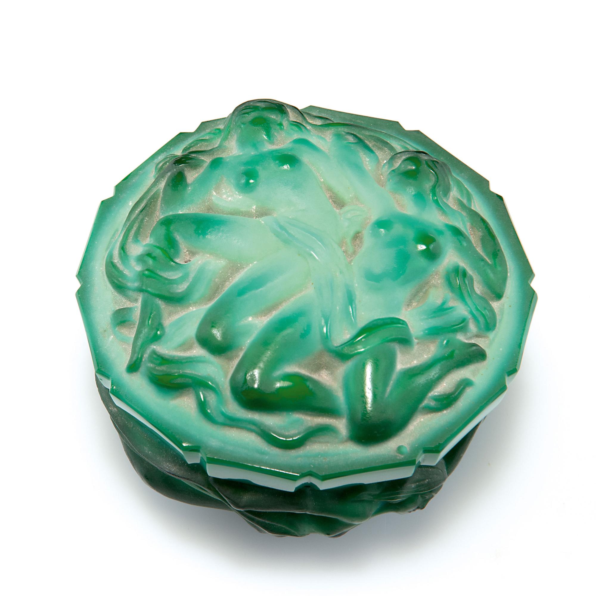 Curt Schlevogt, Gablonz. Box and cover, c1932. H. 6.4 cm; D. 9.5 cm. Designed by Frantisek Pazourek (attributed). Jade glass, reliefed pattern with female nudes.